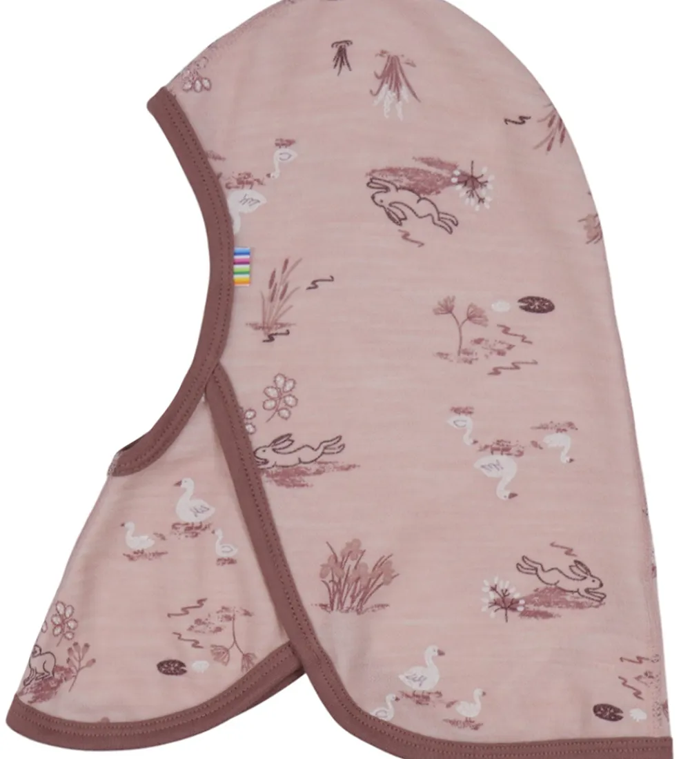 Charmende Joha elefanthue i en blød rosa nuance dekoreret med et fint naturmønster med svaner, blomster og små landskabselementer. Joha elefanthuen har en rund hovedform med kantet afslutning, som giver et klassisk udtryk. Den tætsiddende pasform sikrer varme og beskyttelse mod vind.