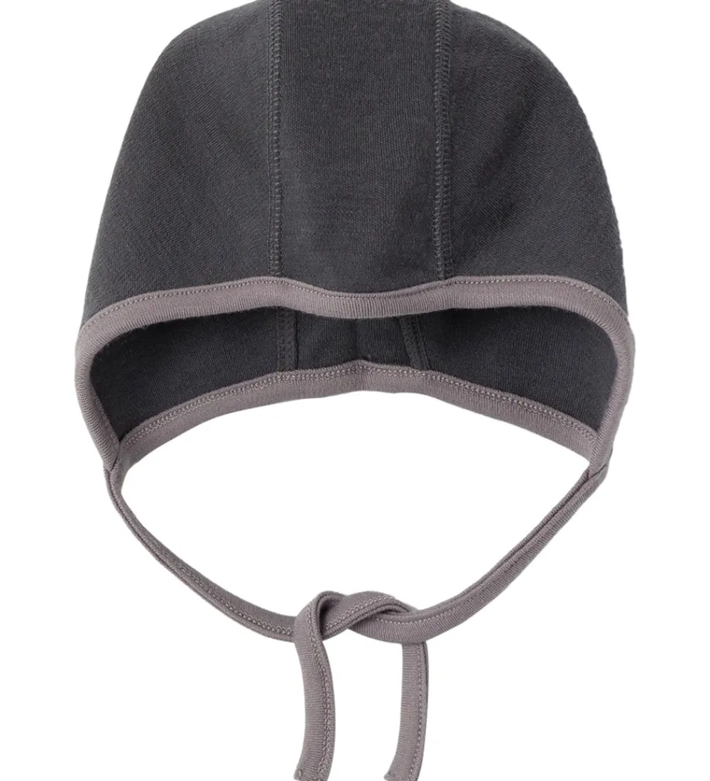 Smart Name It babyhjelm i mørkegrå, med grå kanter og bindebånd.