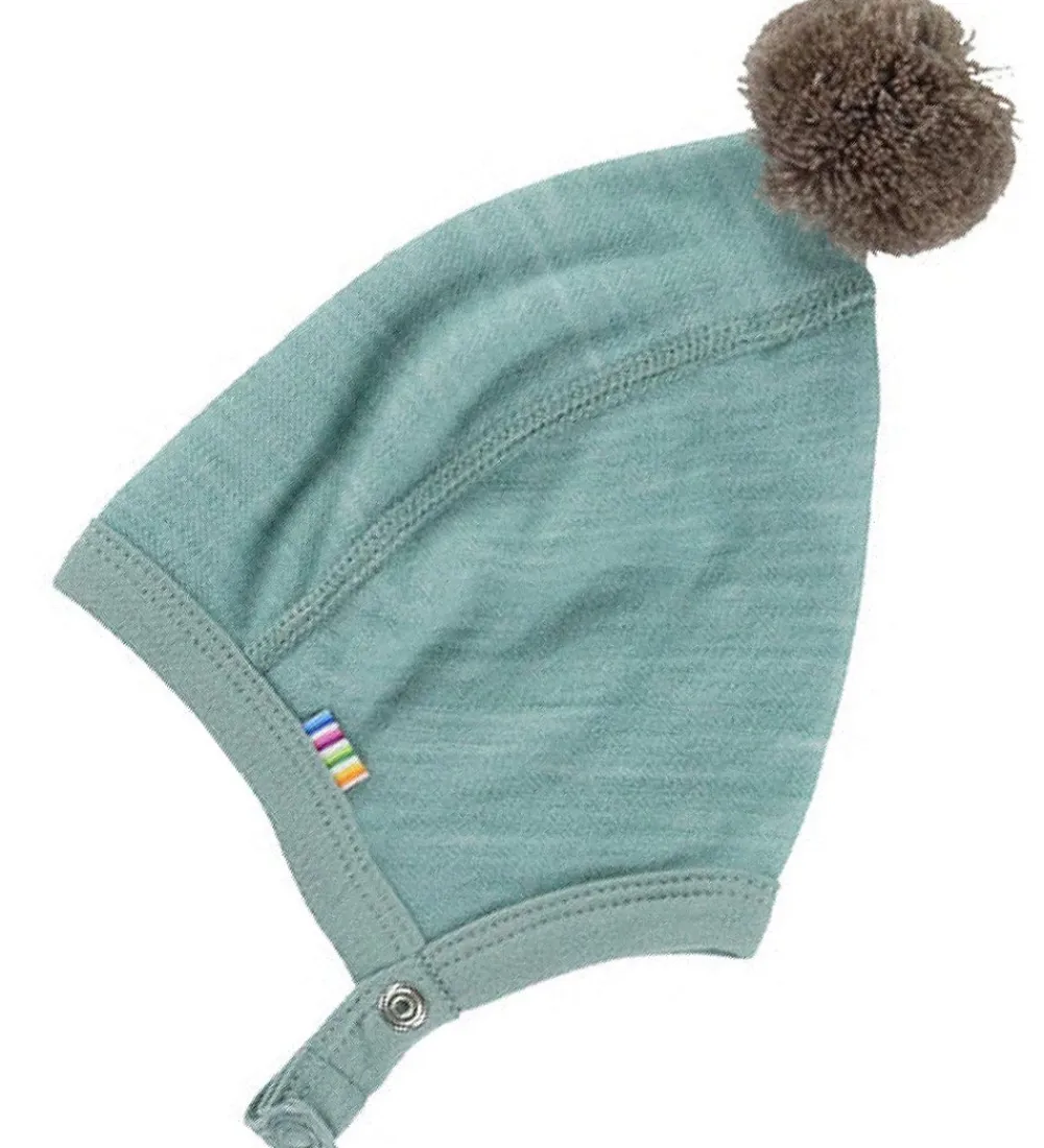 Joha babyhjelmen har en rund og aflang hovedform med en lille kvast i toppen og kan lukkes med praktiske trykknapper under hagen, som har to indstillinger. Babyhjelmen er fremstillet i en blød og lækker blanding af viskose lavet af bambus og uld.