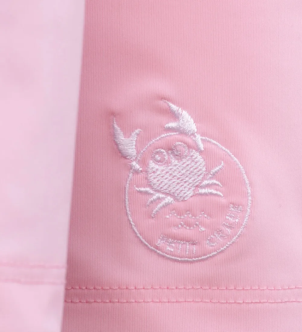 Lækker Petit Crabe badebluse i en lys rosa med et broderet logo nederst. Badeblusen har lange ærmer med flæser henover skuldrene, samt en høj hals.