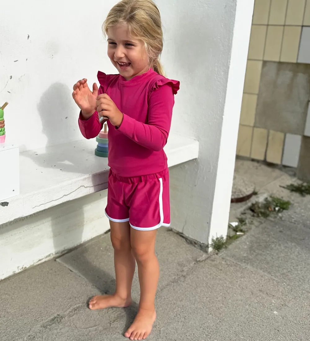 Lækker Petit Crabe badebluse i en dyb rosa med et broderet logo nederst. Badeblusen har lange ærmer med flæser henover skuldrene, samt en høj hals.
