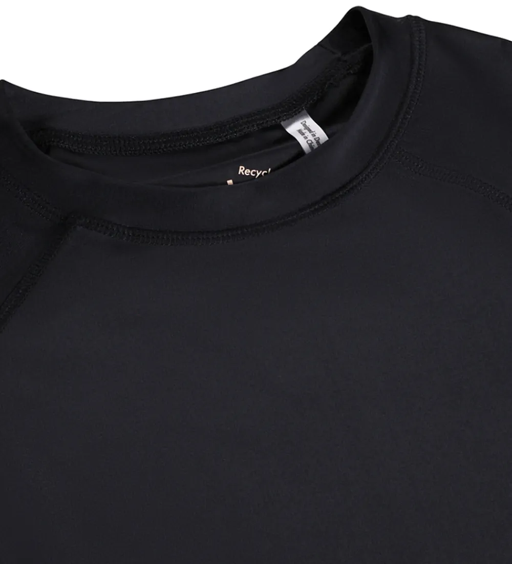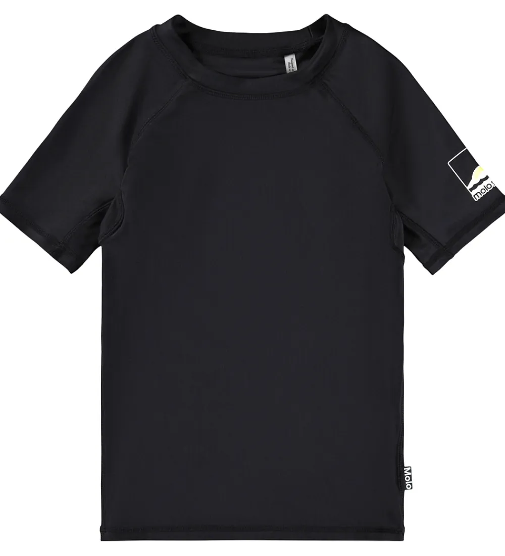 Elegant Molo badebluse i sort med et hvidt og gult logo på venstre ærme. Badeblusen har en rund halsudskæring og korte ærmer. Den har et praktisk UV-filter på 50+.