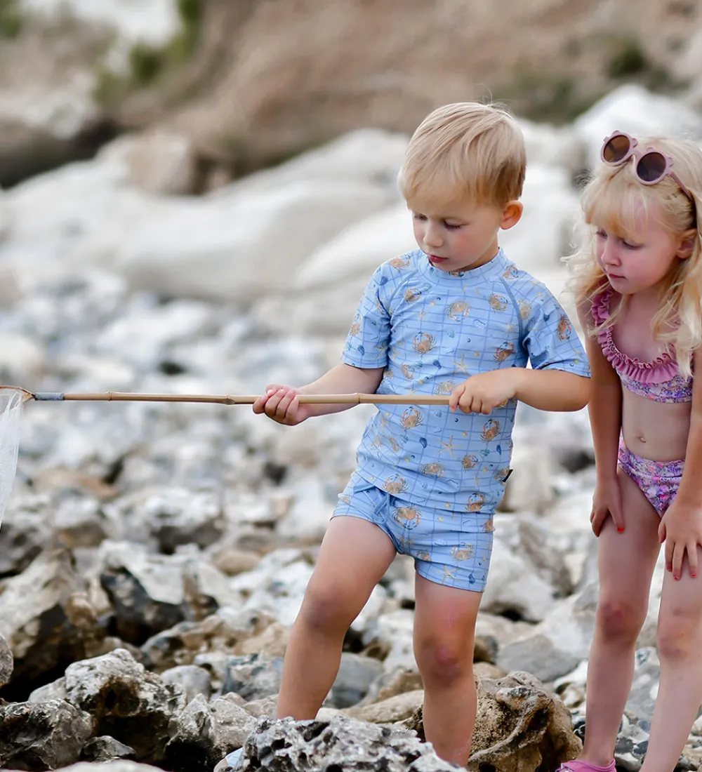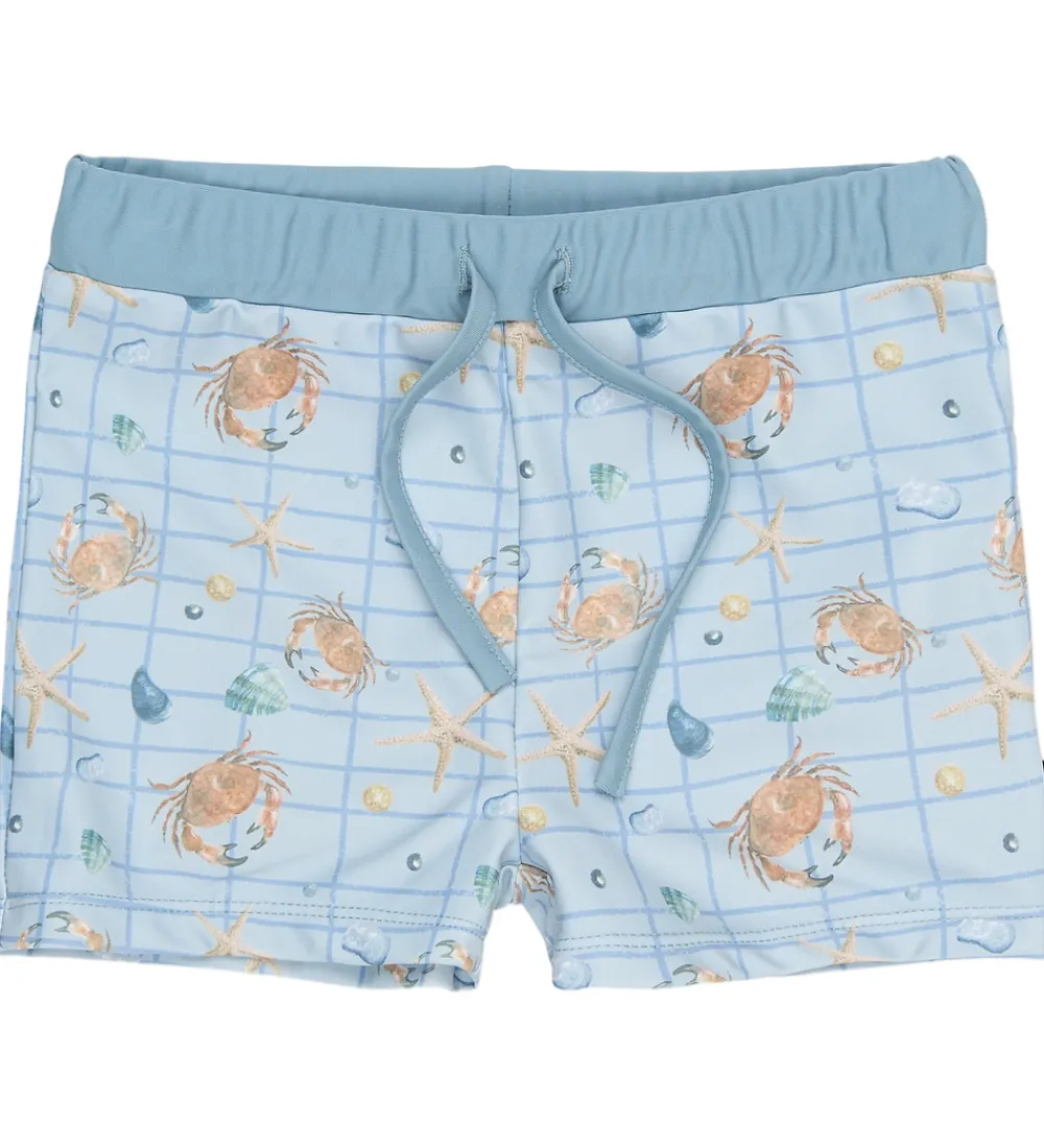 Fine Mikk-Line badebukser i lyseblå med et ternet print og pribt af krabber, søstjerner og muslinger.