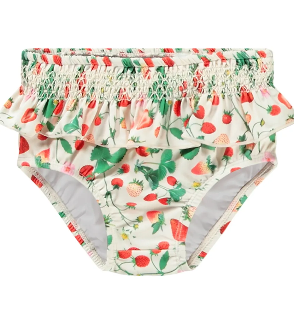 Skønne Molo badebukser i hvid med print af jordbær, blade og blomster. Badebukserne har en bred elastisk talje med en flæsekant øverst. I benåbningerne er der elastikkanter. Badebukserne har plads til en ble.