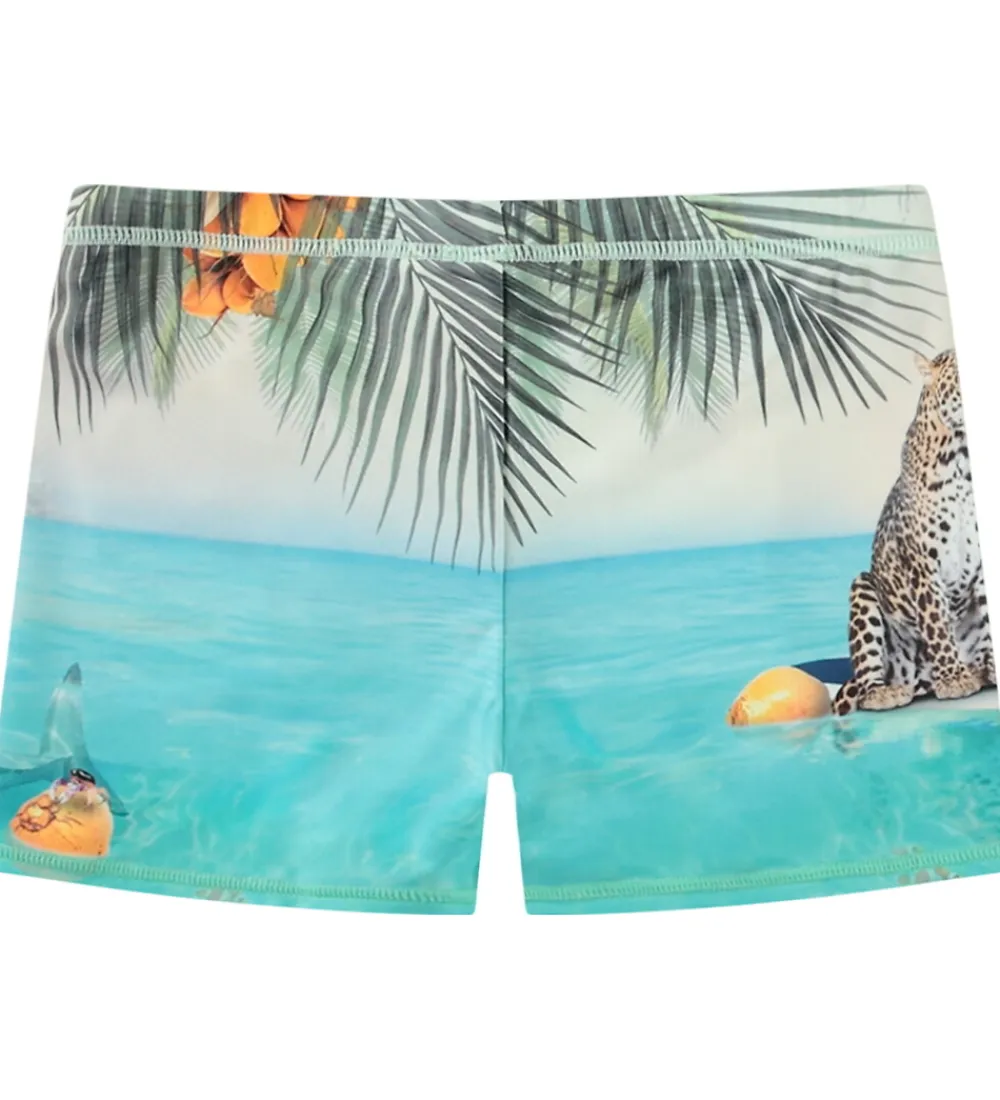 Flotte Molo badebukser med et tropisk print, der inkluderer palmeblade og en leopard på et surfbræt. Molo badebukserne har en elastisk talje, som kan justeres med snøre indvendigt.