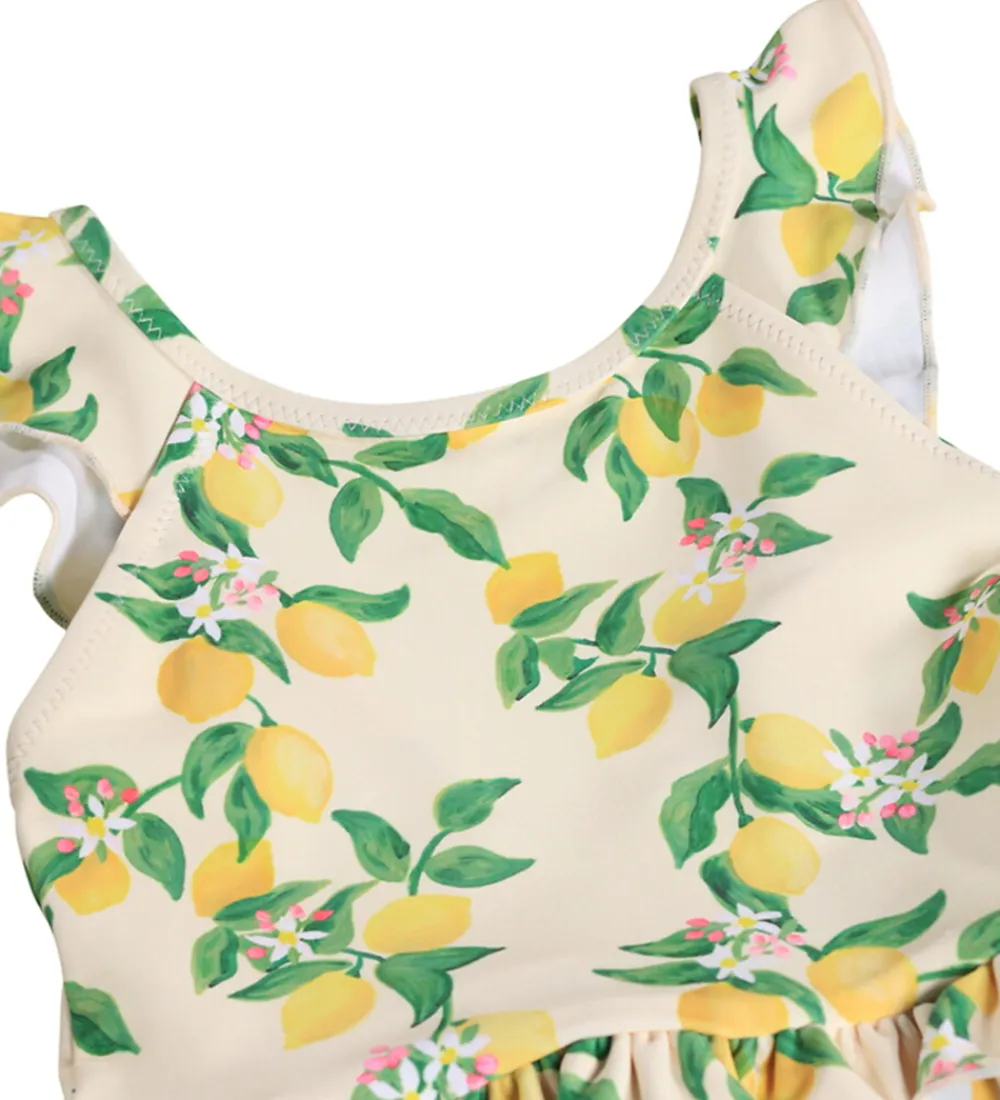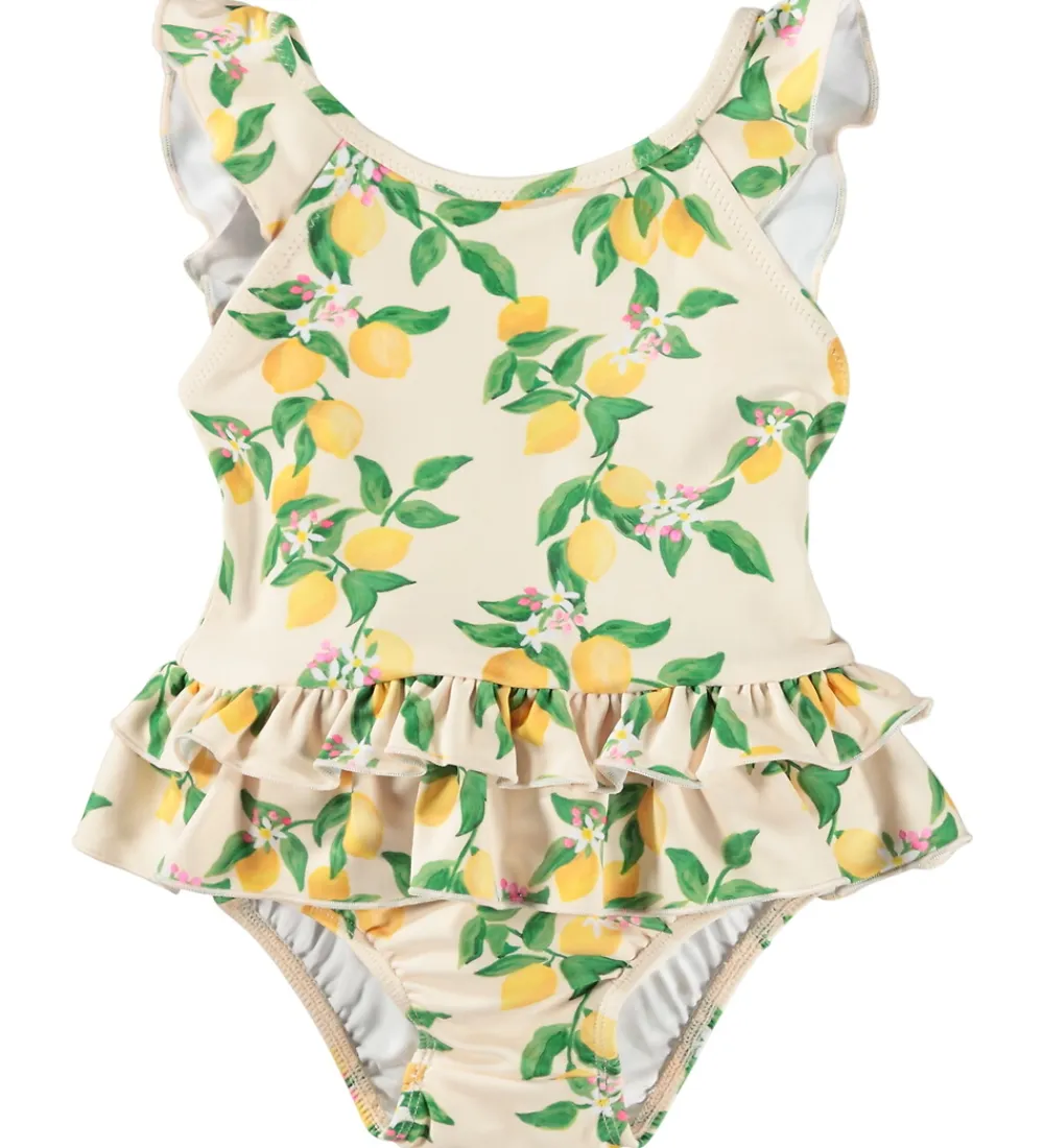 Elegant Molo badedragt med et smukt citronprint i gule og grønne nuancer på en lys baggrund.