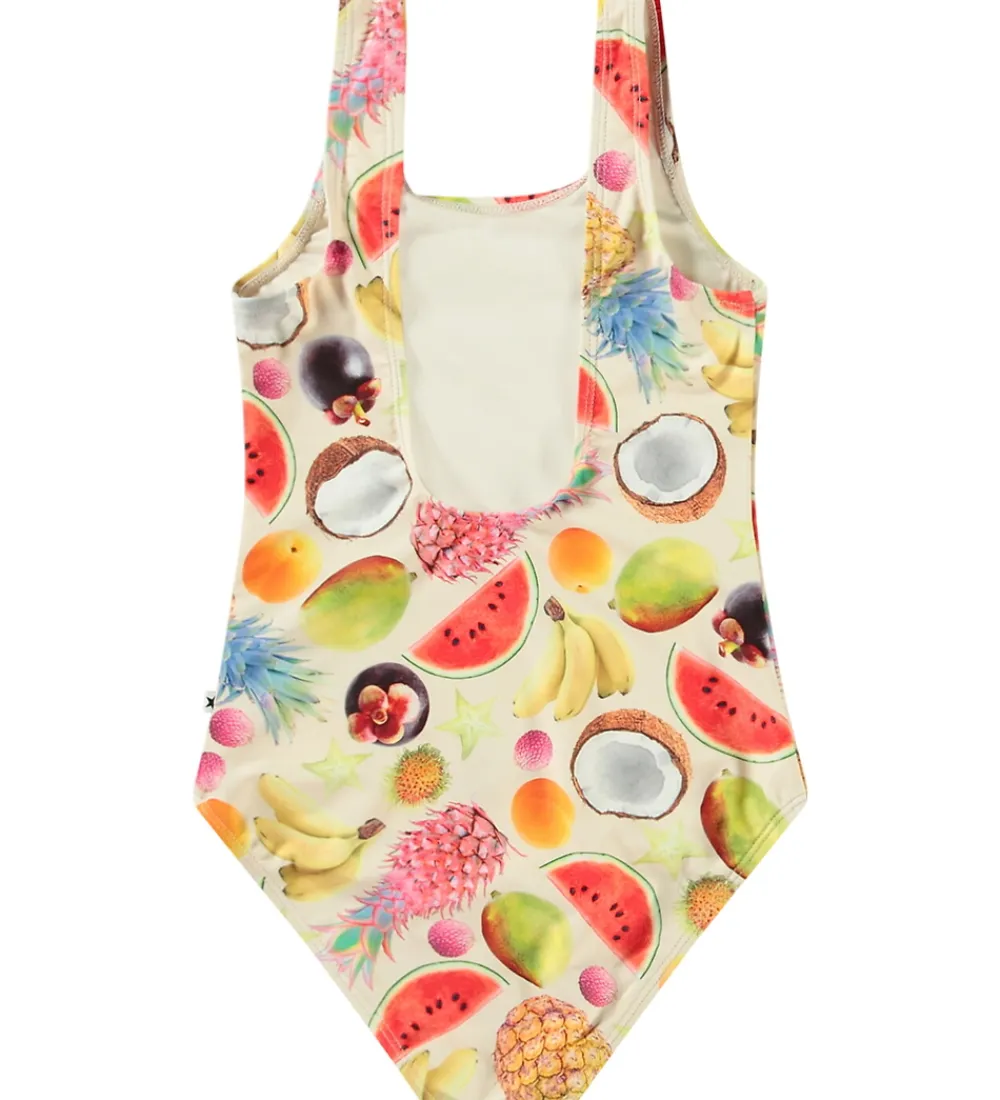 Molo badedragten har brede skulderstropper og en rund halsudskæring. Den har en dyb udskæring i ryggen og smalle elastikkanter i alle åbninger.