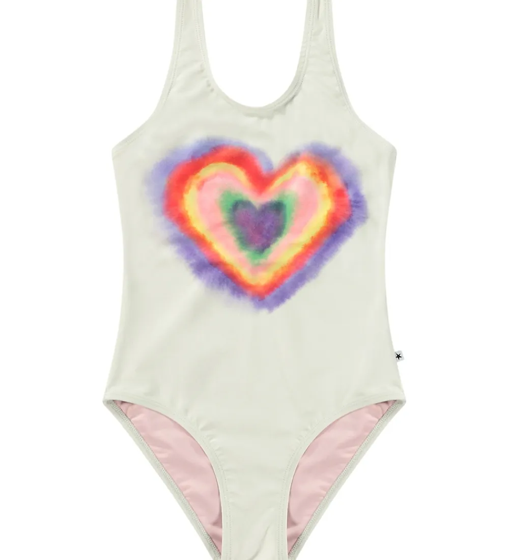 Smuk Molo badedragt i hvid med et farverigt, hjerteformet print på brystet.