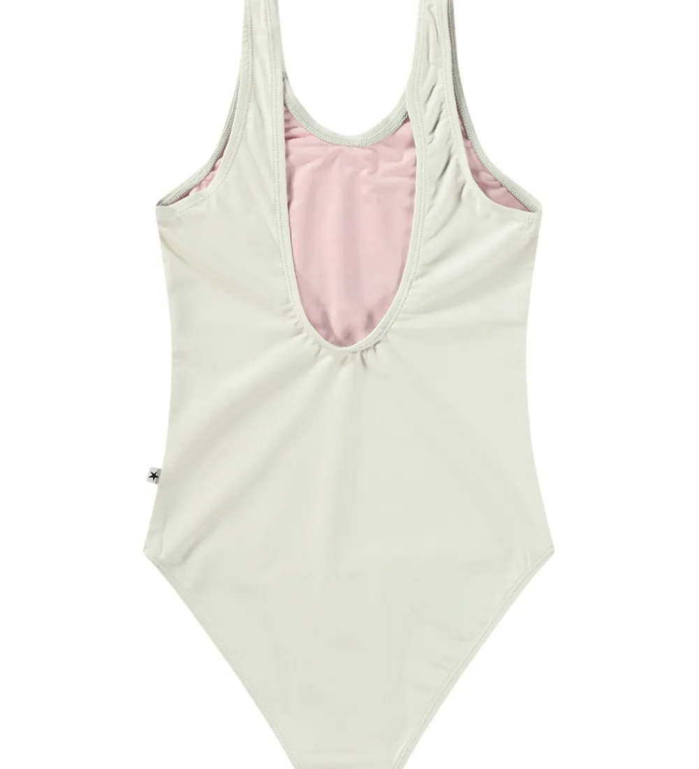 Molo badedragten har brede skulderstropper og en rund halsudskæring. Den har en dyb udskæring i ryggen og smalle elastikkanter i alle åbninger.