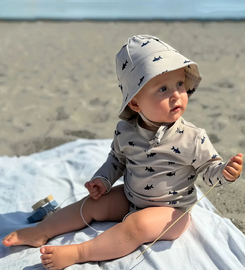 Skøn Petit Crabe badehat i beige med et allover print af navy fisk.