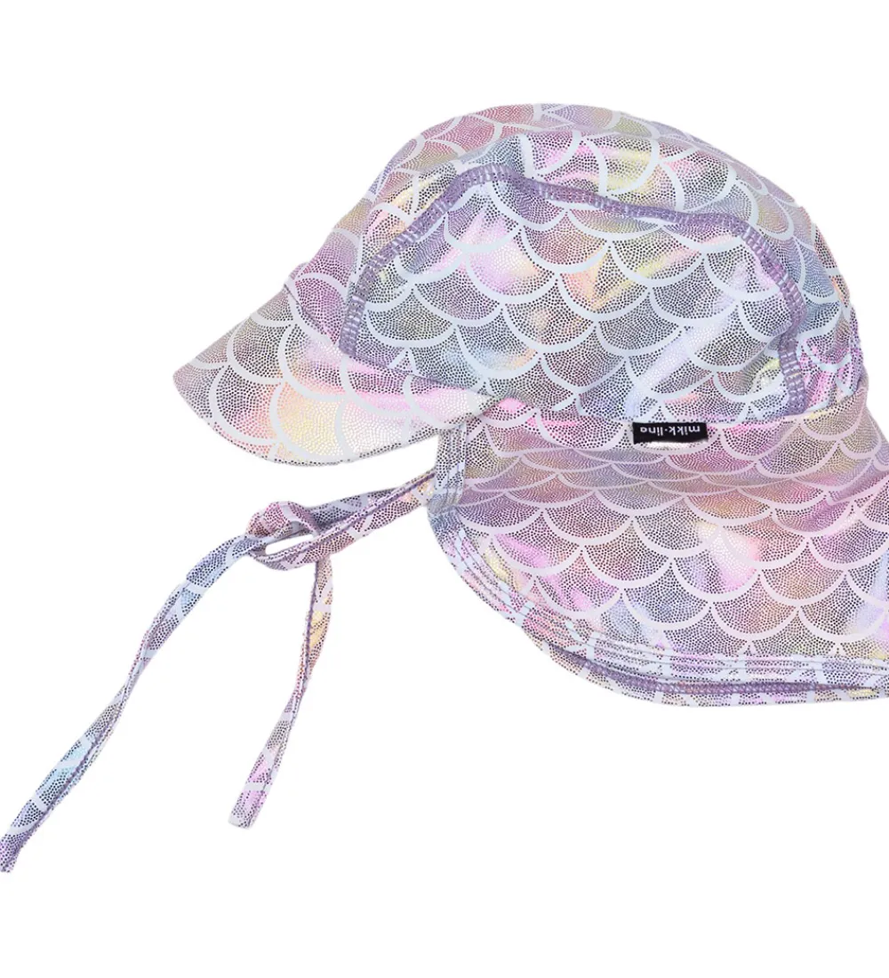 Skøn Mikk-Line badehat i lys lilla med et farverigt havefrue-skæl print med en metallisk effekt.