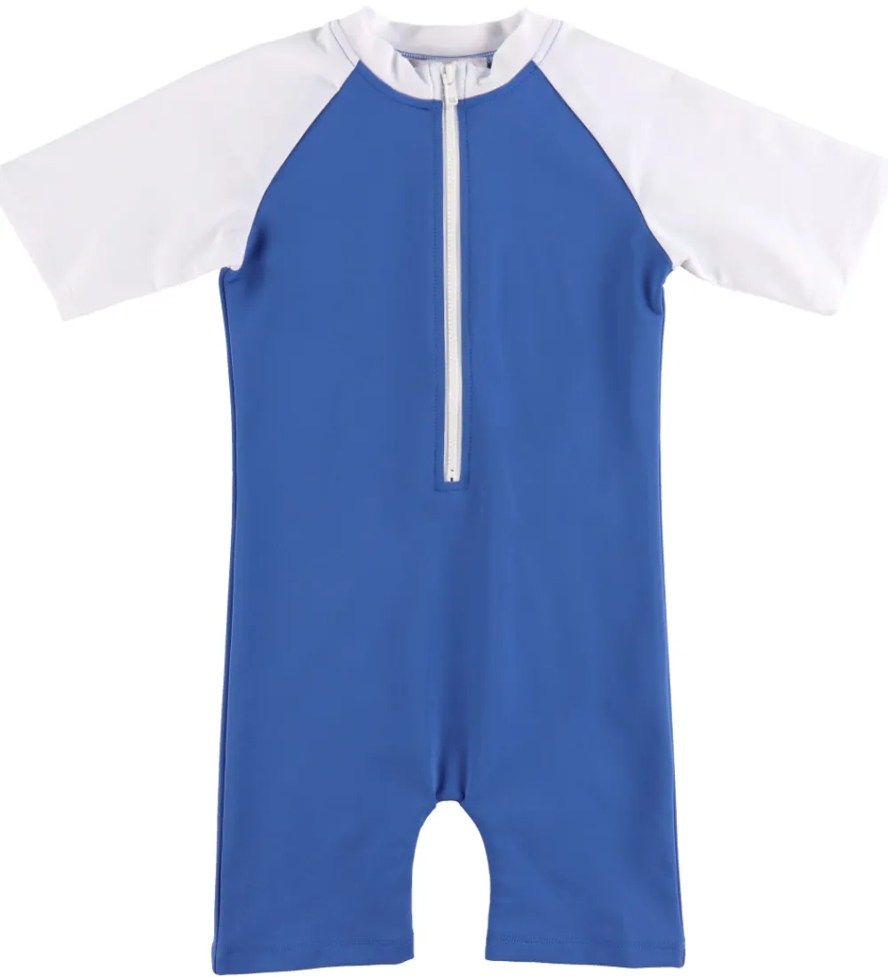 Smart Petit Crabe badeheldragt i blå med hvide ærmer. Petit Crabe designet kombinerer funktionalitet og stil med sine flotte farver, der skiller sig ud ved poolen eller stranden.