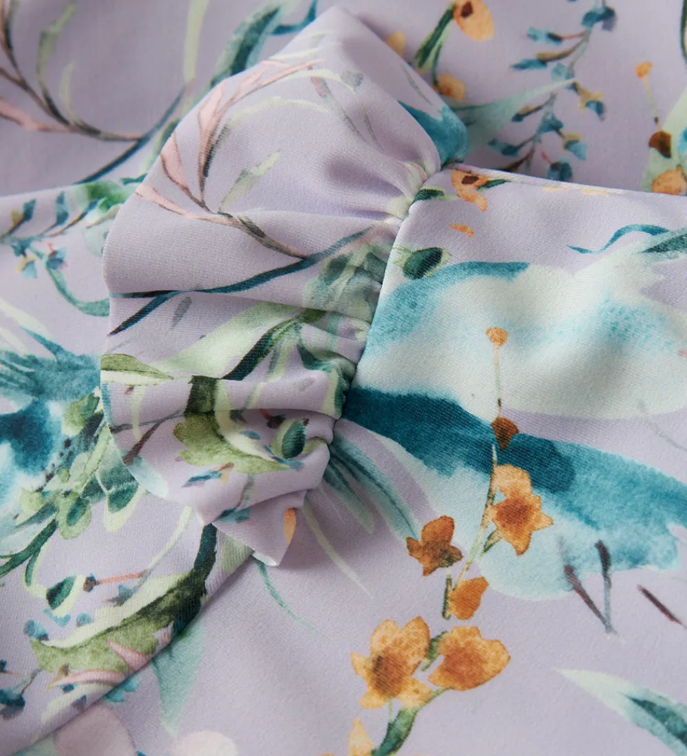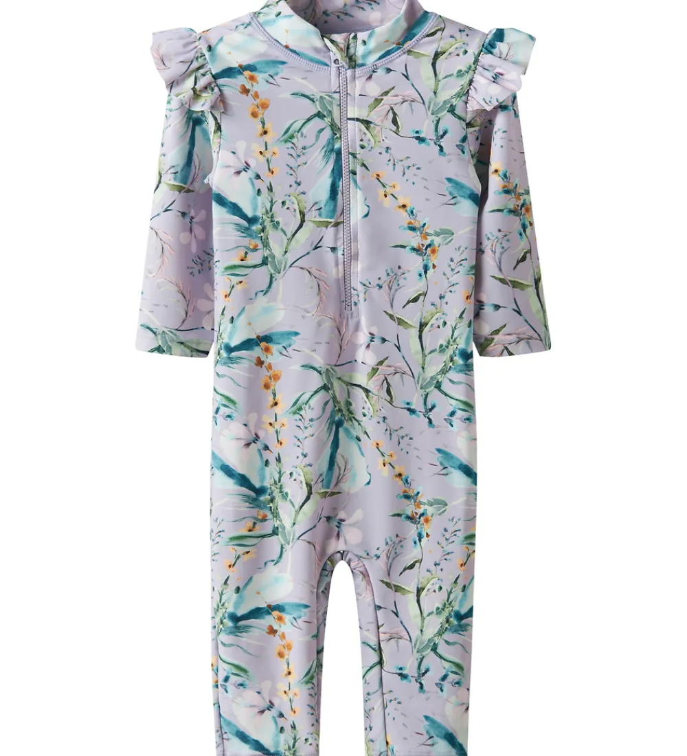 Fin Name It badeheldragt med 3/4 lange ærmer i en lys, lilla nuance med et farverigt blomsterprint. Badeheldragten har fine flæsedetaljer ved skuldrene, der giver et sødt udtryk.