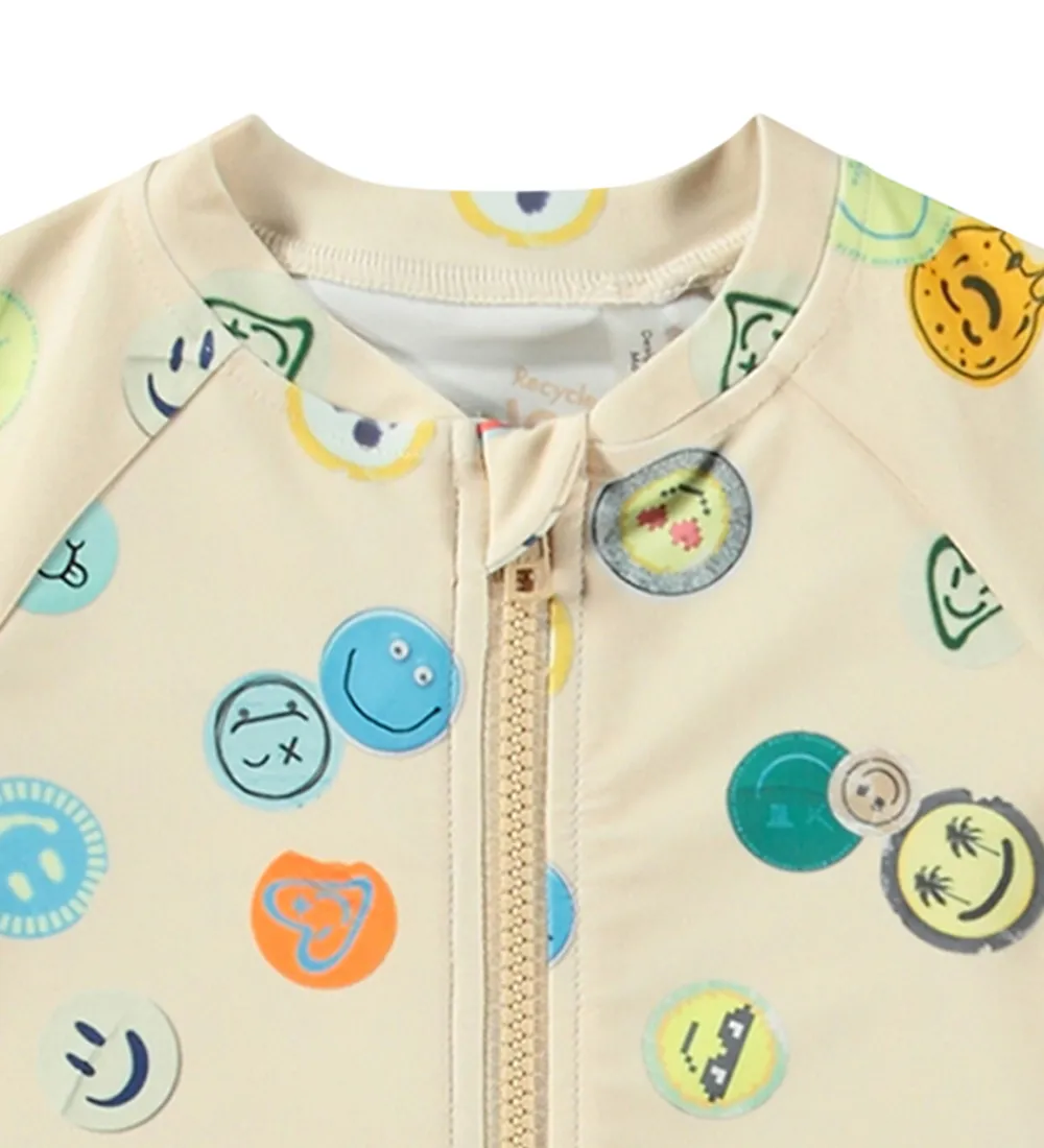 Smart Molo badeheldragt i beige med print af farverige smileys. Badeheldragten har en rund halsudskæring med en praktisk lynlås foran med hagebeskytter og indvendig vindstolpe. Badeheldragten har korte ærmer og korte ben.
