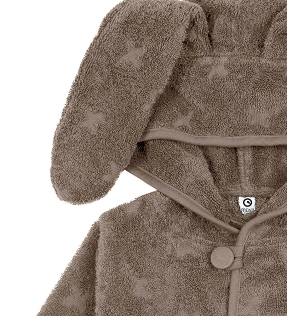 Skøn Müsli badekåbe i støvet brun med et mønster af indprægede stjerner og med søde kaninører på hætten.