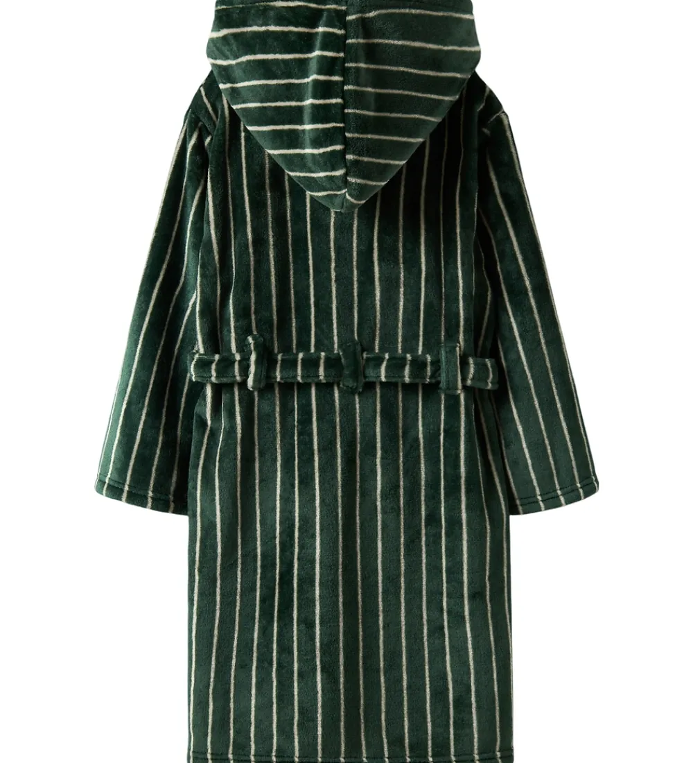 Elegant Name It badekåbe med vandrette striber i mørkegrøn og hvid. Den har en blød, plysset struktur, som giver et behageligt udseende.
