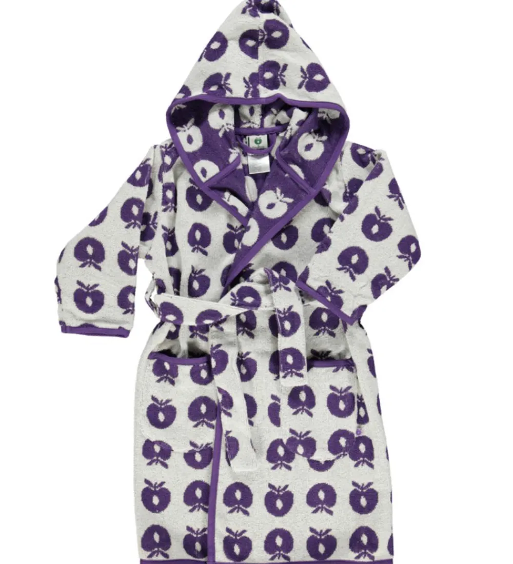 Smart Småfolk badekåbe i hvid frotté med et allover print af de klassiske Småfolk æbler i lilla.
