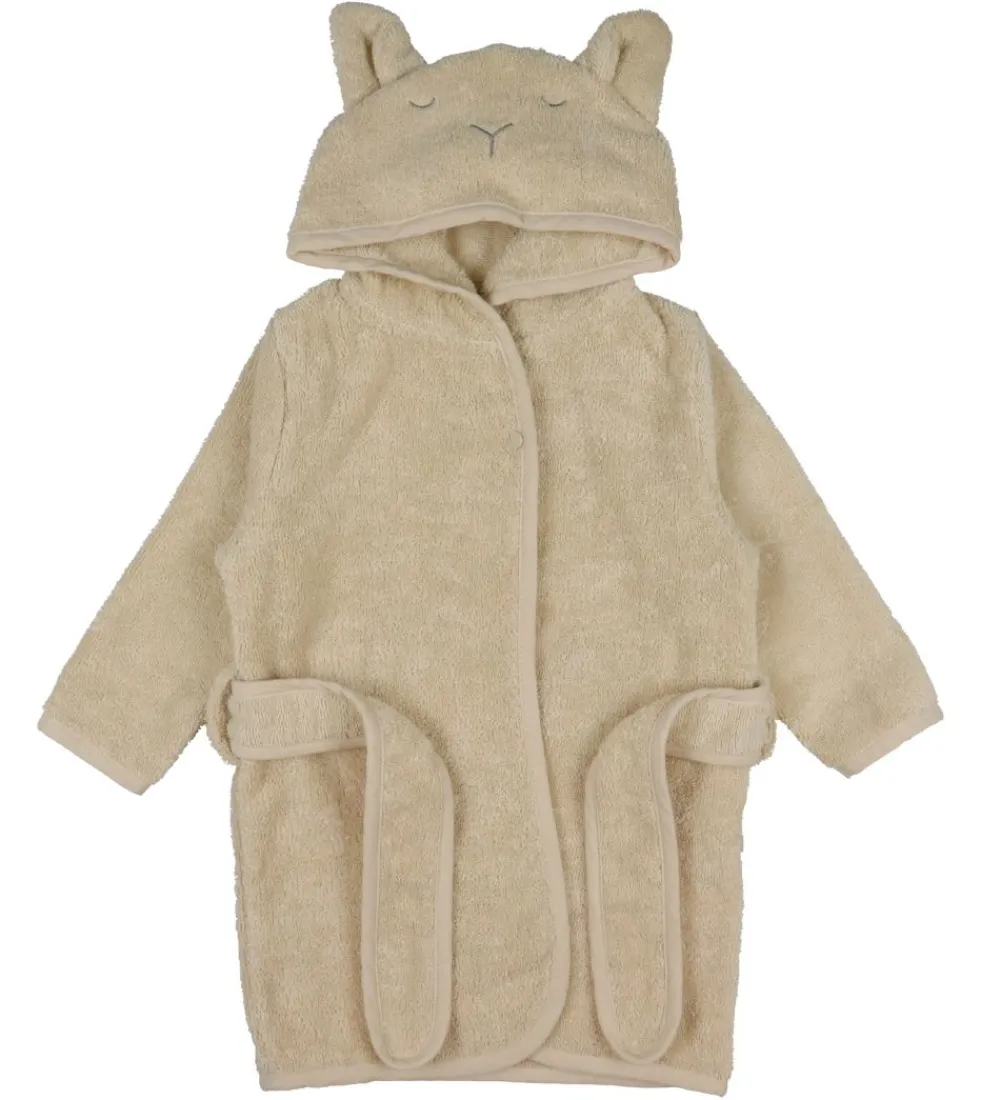 Smart Pippi Baby badekåbe i beige, med en fastsyet hætte udformet som en ræv, med store ører.