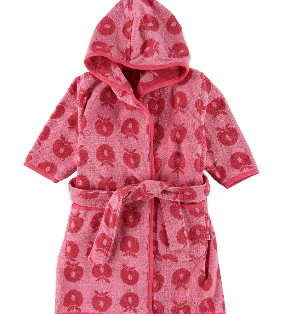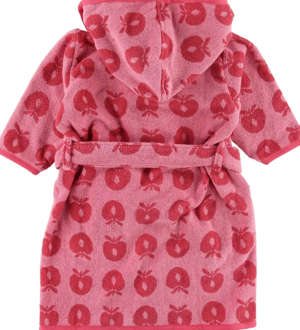 Blød og lækker Småfolk badekåbe i rosa med allover print af de klassiske Småfolk-æbler.