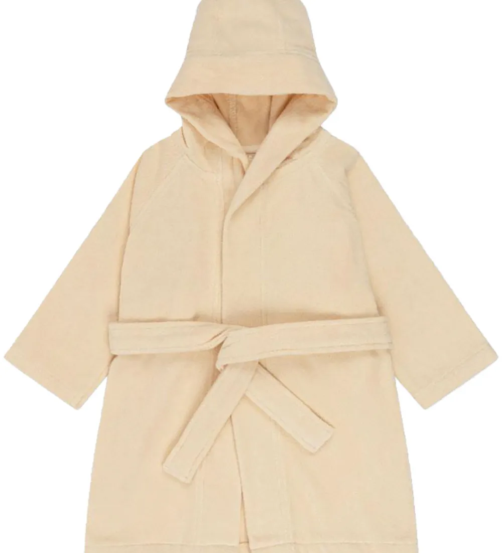 Konges Sløjd badekåben er lavet af blødt frotté og har en fast hætte samt lange ærmer. Badekåben bindes i livet med et bredt bindebånd, der sidder fast i siderne.