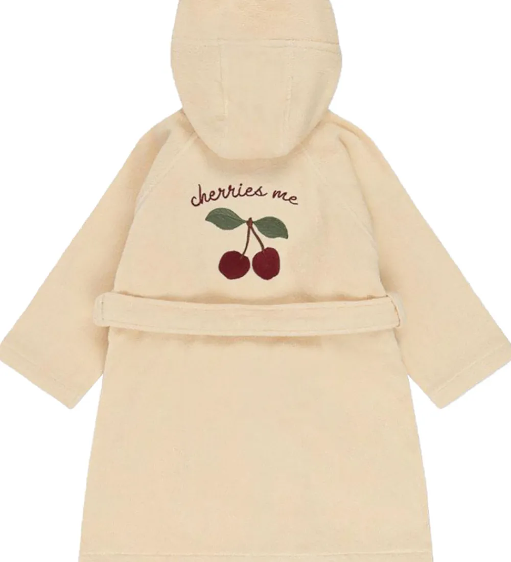 Smuk Konges Sløjd Badekåbe i en lys beige farve med et stort kirsebær samt teksten “cherries me” broderet på ryggen.
