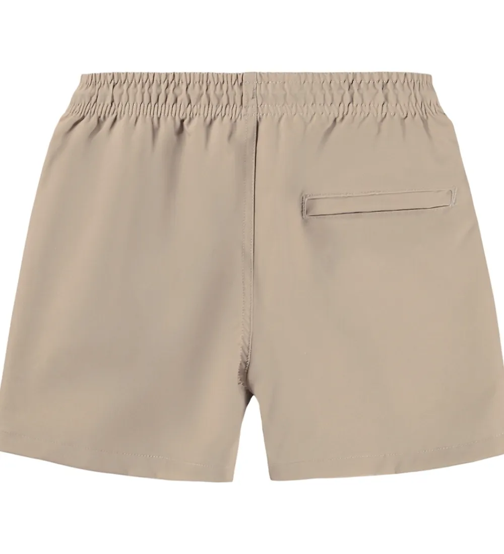 Seje Molo badeshorts i mørk beige med print af en banan og to citroner, som udgør en smiley på det ene ben og et logoprint på det andet ben. Molo badehortsene har en bred elastikkant i taljen, der kan justeres med praktiske snører foran. Indvendigt er der mesh med elastiske åbninger i benene. Badeshortsene har et praktisk UV-filter på 50+.