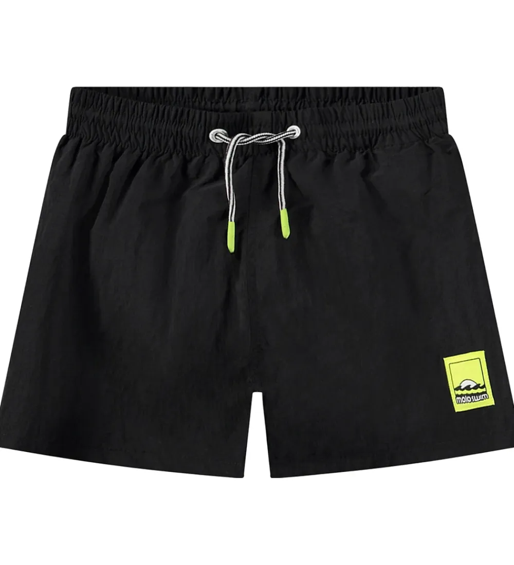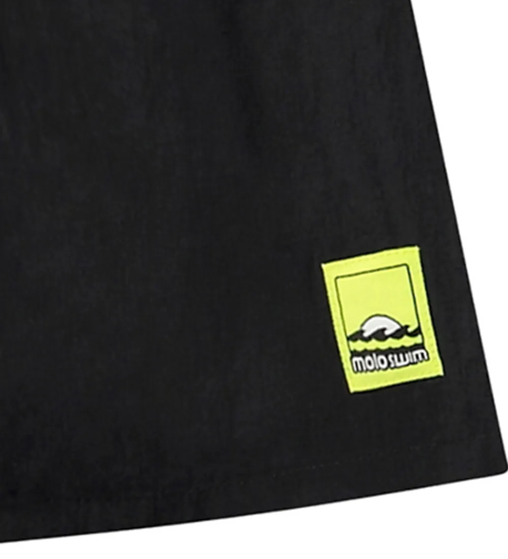 Stilfulde Molo badeshorts i sort med et logo på venstre lår i neongul. Badeshortsene har en god elastik i taljen, som kan justeres med snøre. Bagpå er der en praktisk lomme. Indvendigt er der net med elastik i benåbningerne.