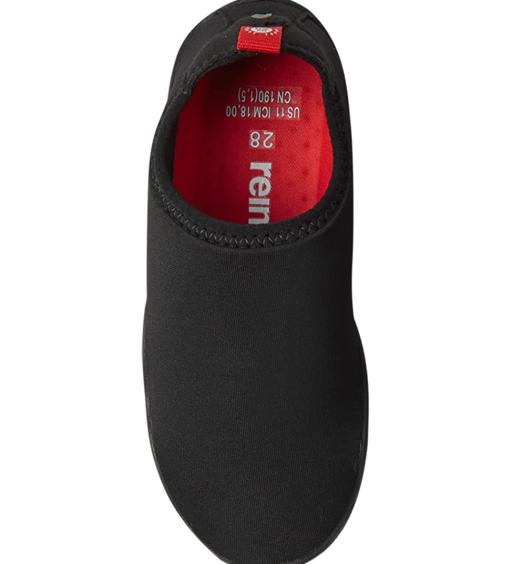 Praktiske Reima badesko i ensfarvet sort med en rød hælstrop.