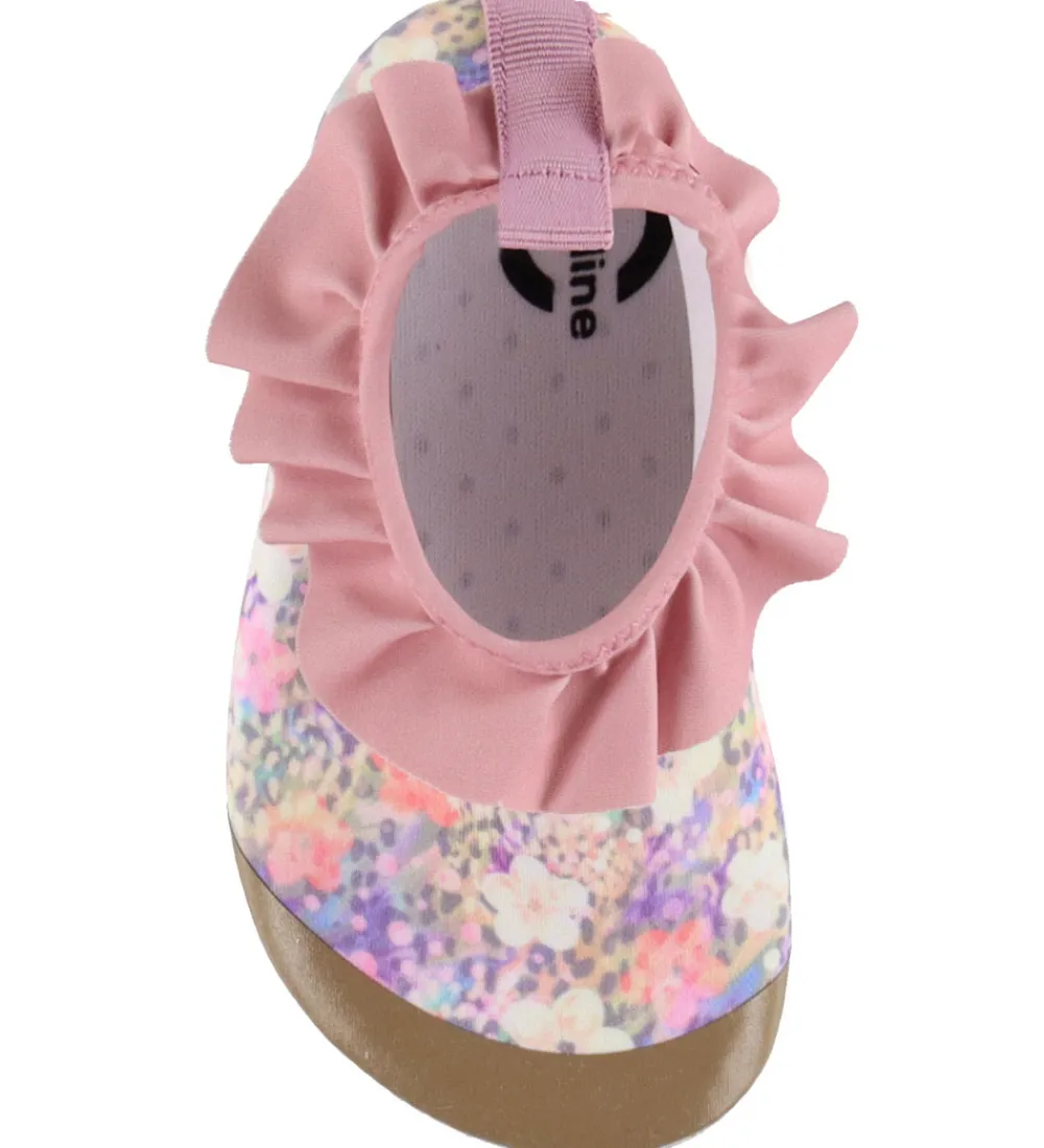 Fine Mikk-Line badesko i blomstret design med en rosa flæsekant omkring åbningen og brune detaljer.