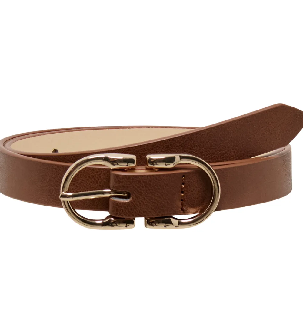 Elegant Kids Only bælte i en varm brun farve. Bæltet har et fint spænde i guld, og tilføjer et stilfuldt udtryk til outfittet. Bæltet er fremstillet af polyester med PU-coating.