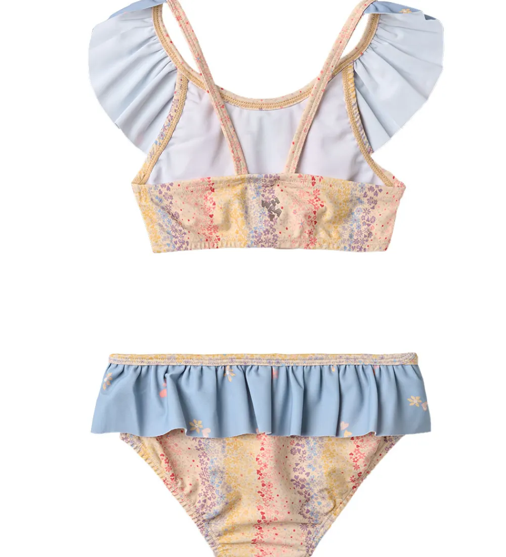 Charmerende Wheat bikini med et sprudlende blomsterprint i delikate nuancer af blå, gul og rosa. Overdelen har en bred volantkant hele vejen rundt, som skaber en elegant stil.