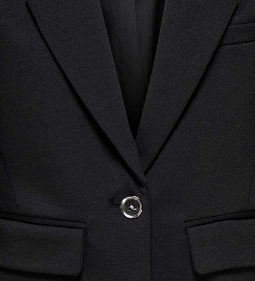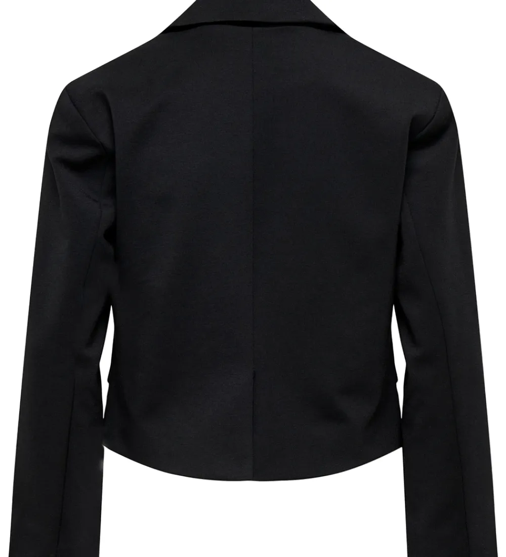 Elegant blazer fra Kids Only i sort med klassisk krave og enkel knaplukning. Ved skuldrene er der tynde skulderpuder, som giver en flot pasform. Foran er der to lommer og en brystlomme.