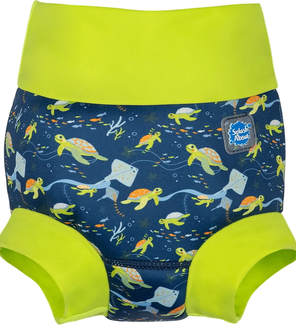 Praktiske Splash About blebadebukser i mørkeblå og neongrøn med et sødt havprint.