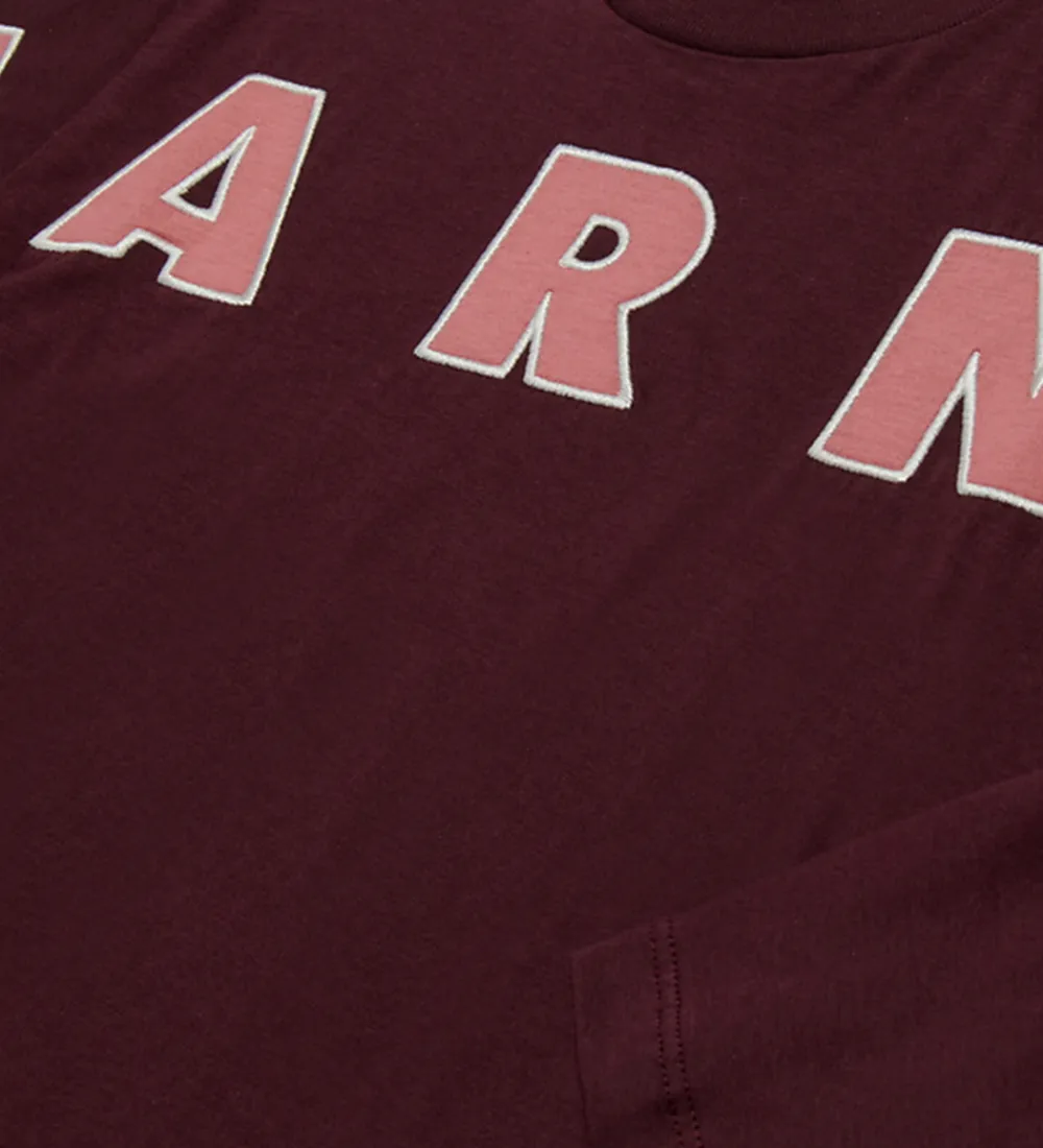Elegant Marni bluse med lange ærmer i en dyb bordeaux farve. Fortil står der “Marni” med store, applikerede bogstaver i rosa med hvide kanter. Den runde halsudskæring sikrer en klassisk stil, mens det enkle design fremhæver Marni mærkets kendetegn.