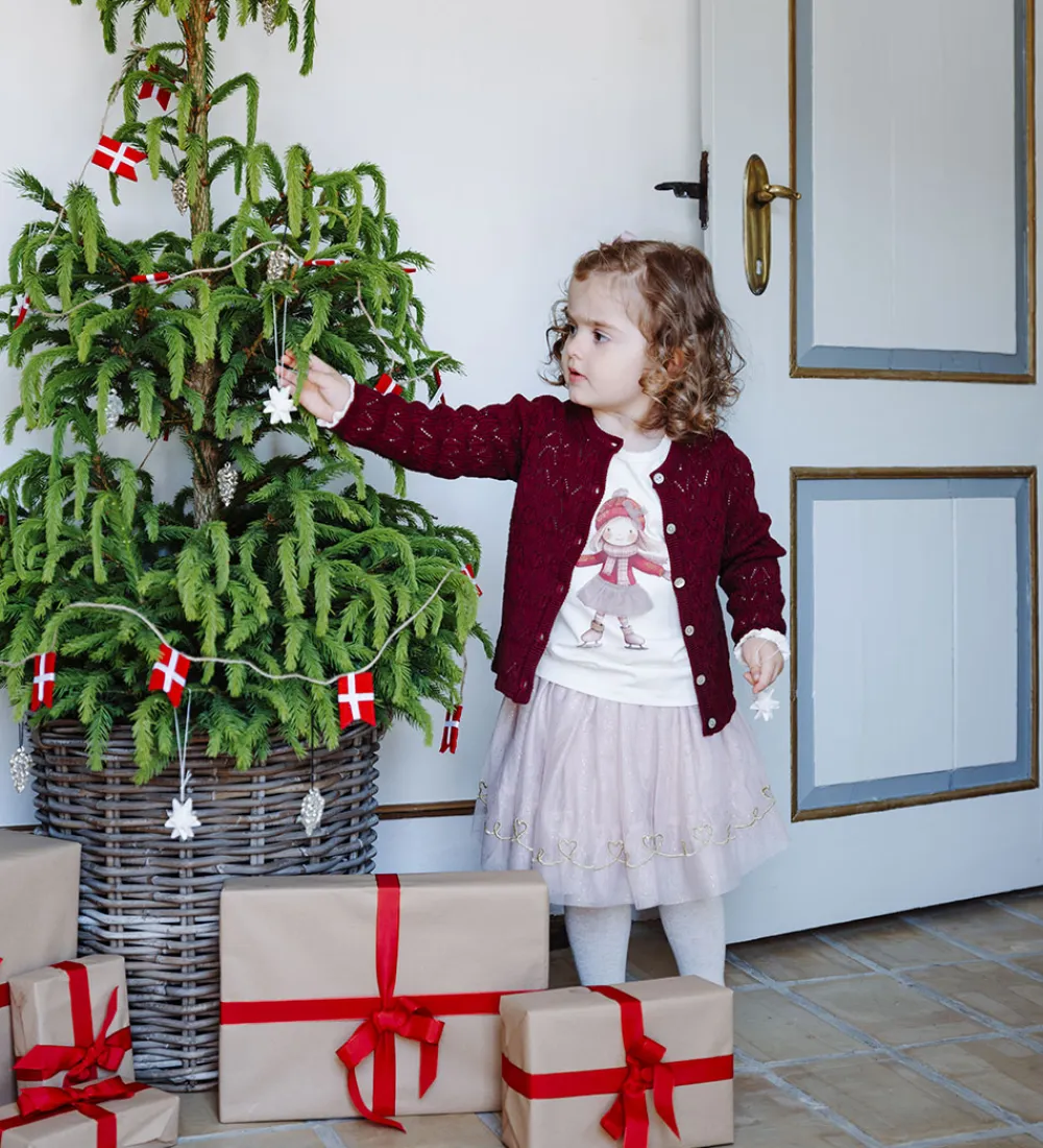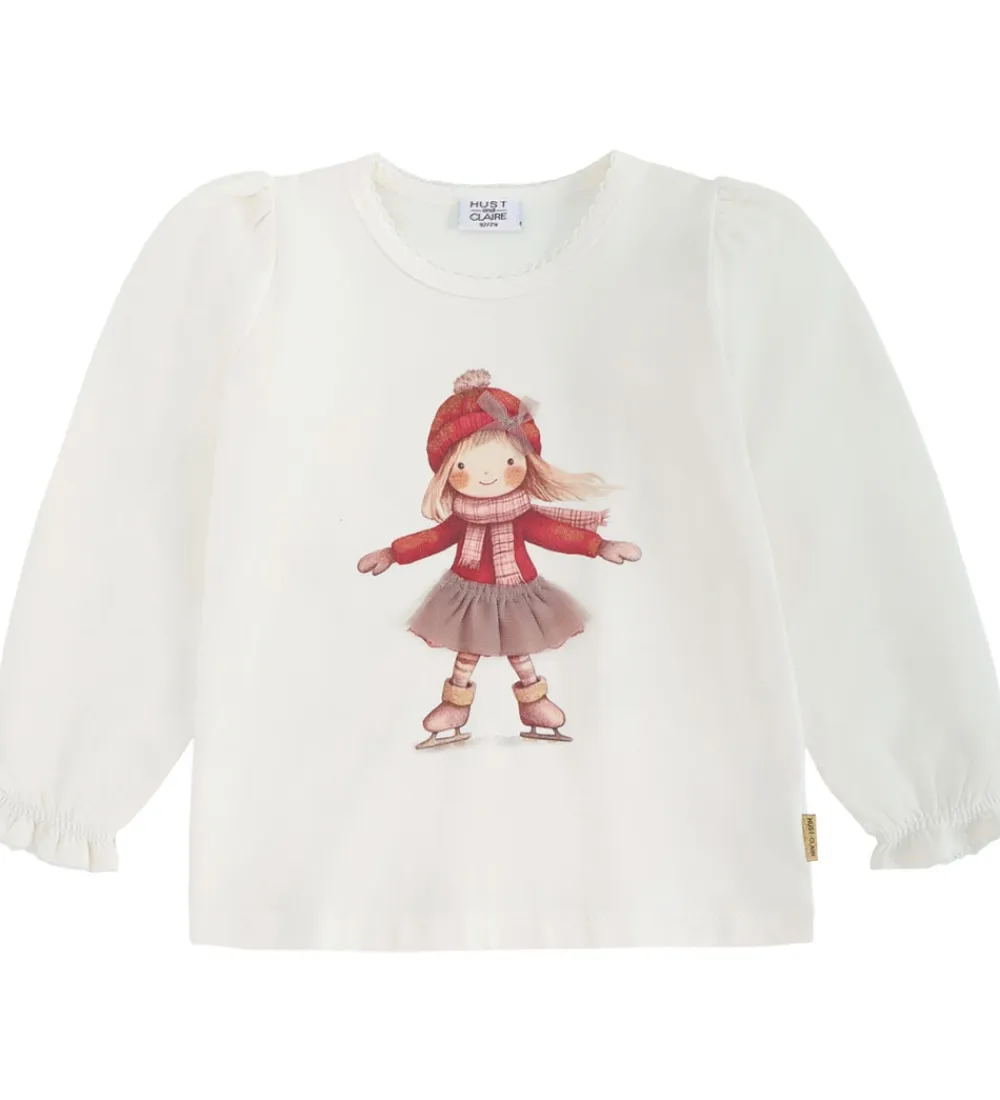 Charmerende Hust and Claire bluse i hvid med et motiv af en pige på skøjter, og hendes nederdel er dekoreret med tyl. Blusen har lange ærmer og en rund halsudskæring. De let puffede ærmer afsluttes med elastiske kanter, der skaber en diskret rynkeeffekt.
