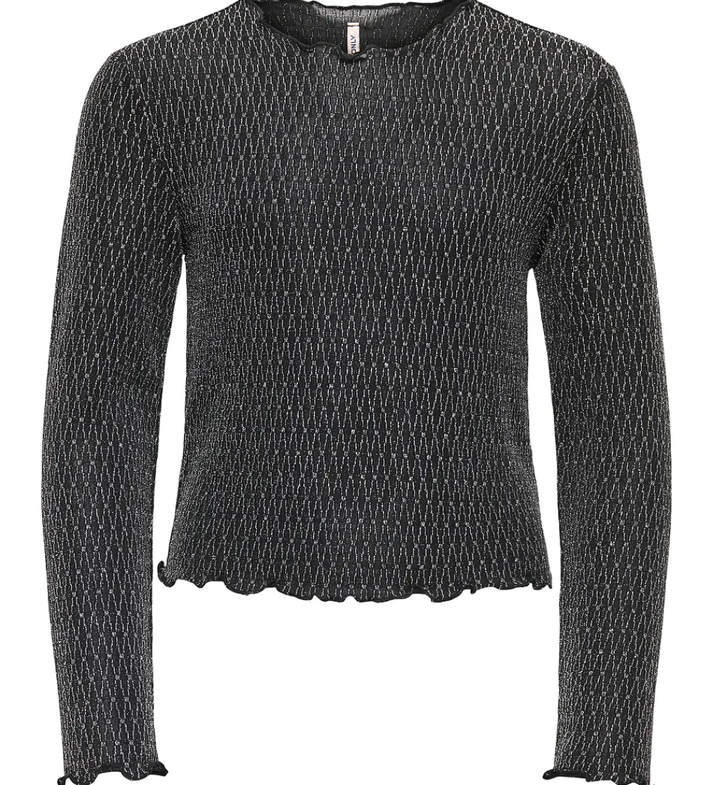 Elegant Kids Only bluse med lange ærmer i en klassisk, sort farve, dekoreret med et diskret mønster af zigzaglignende linjer med sølvglitter.