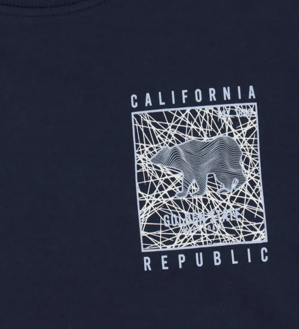 Stilfuld Name It bluse med lange ærmer. Den er navyblå med et enkelt print på brystet, der viser en bjørn og teksten “California Republic.”