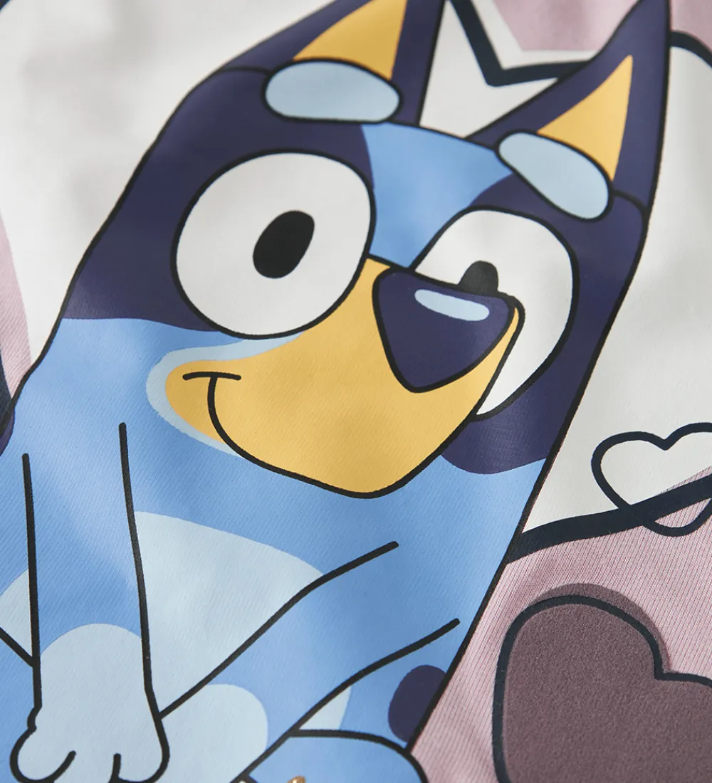 Blusen prydes af et farverigt Bluey-motiv med et stort hjerte i baggrunden samt mindre hjerter omkring motivet. Blusen har en rund halsudskæring, hvilket giver et enkelt udtryk. Name It kombinerer stil og funktionalitet i denne fine bluse.