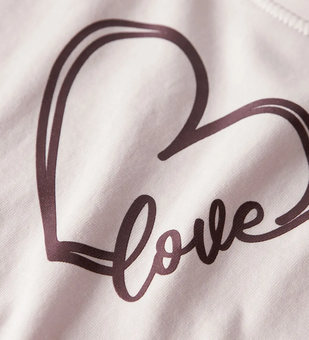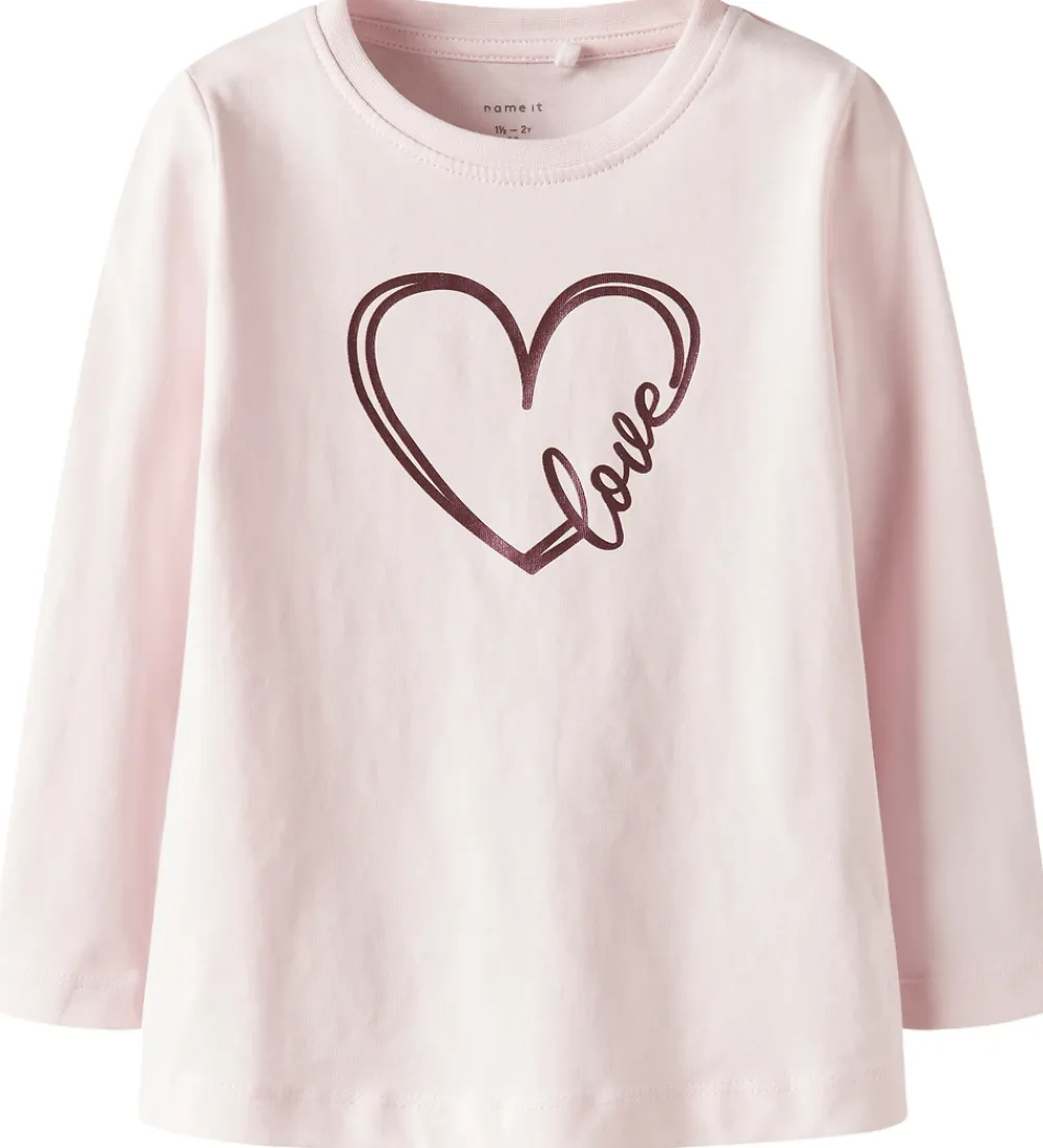 Skøn Name It bluse i lys rosa med et print foran af et hjerte og teksten “Love” i en mørk lilla nuance. Den har en rund halsudskæring med en smal ribkant og lange ærmer.