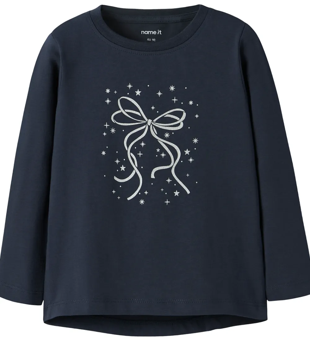 Fin Name It bluse i navyblå med print foran af en sløjfe og små stjerne i sølv glimmer. Blusen har en rund halsudskæring med en smal ribkant og lange ærmer.
