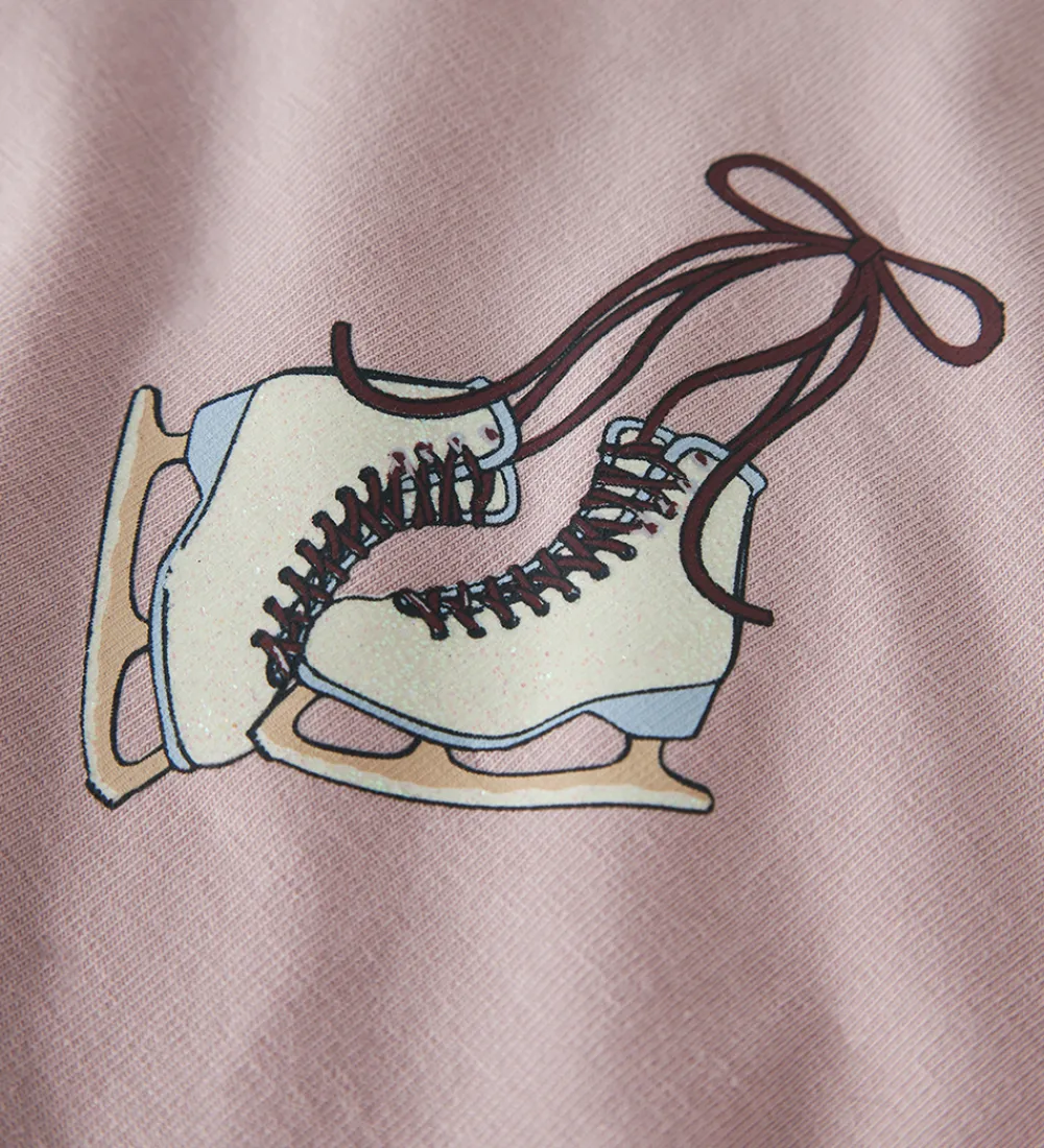 Elegant Name It bluse i rosa med print af skøjter på venstre bryst. Blusen har en rund halsudskæring med en smal ribkant og lange ærmer.