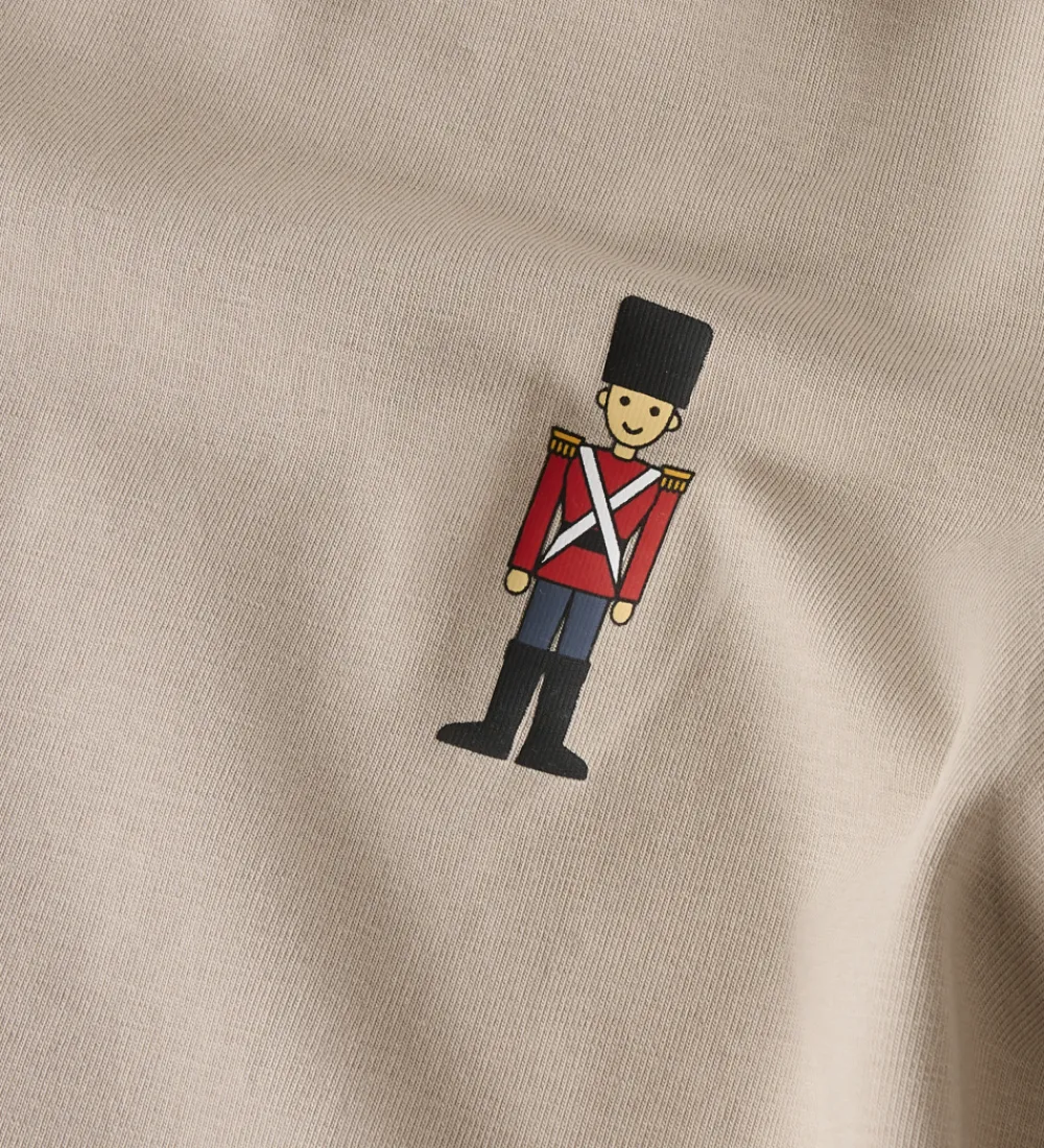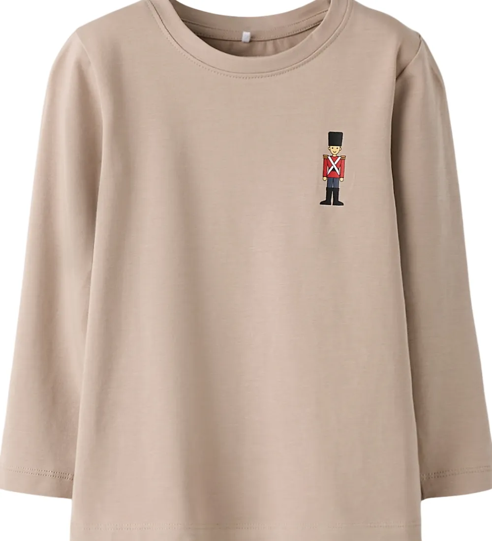 Flot Name It bluse i beige med et lille print på venstre bryst af en garder. Blusen har en rund halsudskæring med en smal ribkant og lange ærmer.