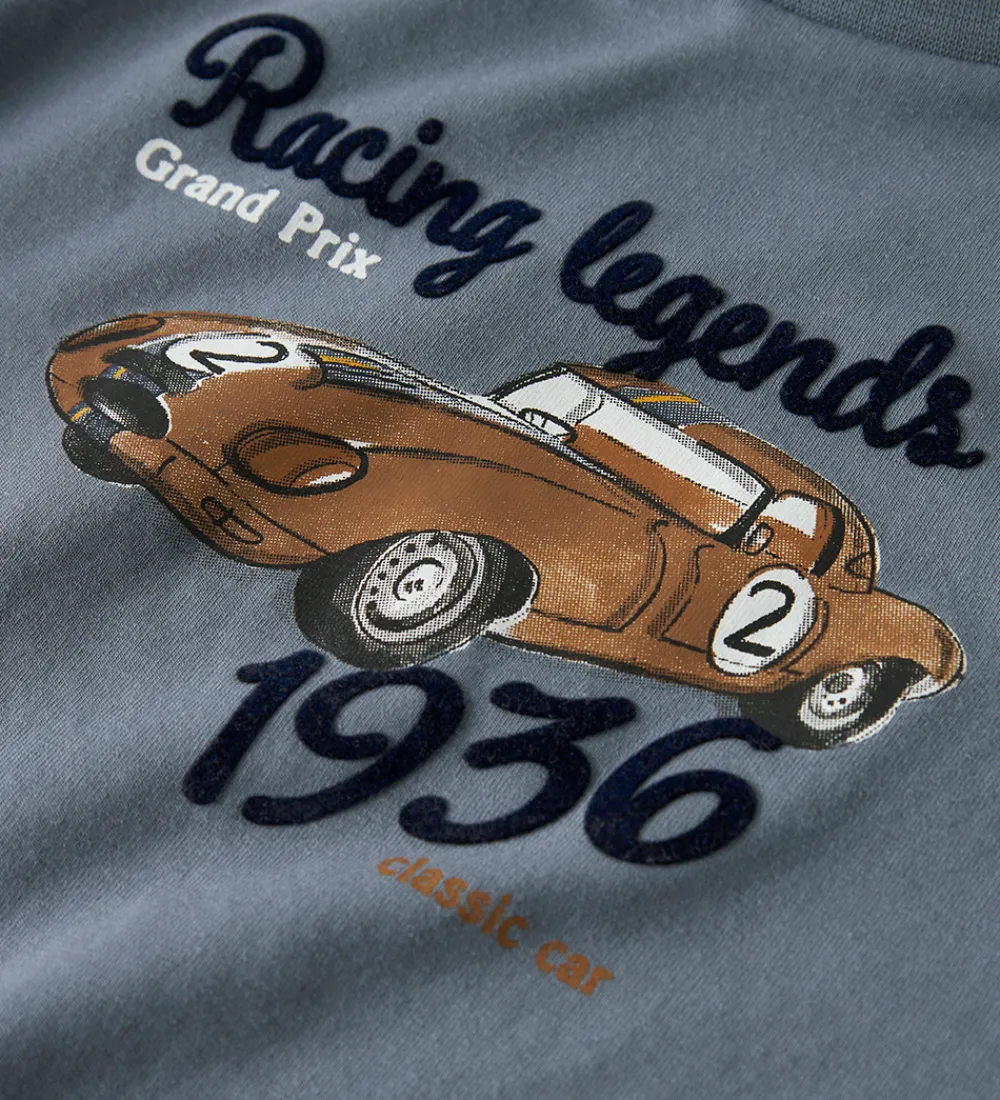 Flot Name It bluse med lange ærmer. Blusen er i en støvet blå nuance og har et print af en vintage racerbil med teksten “Racing legends Grand Prix 1936”. Den runde halsudskæring giver et klassisk look.