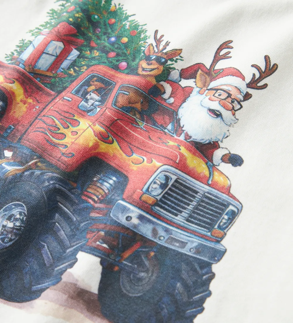 Sjov Name It bluse i hvid med et print af en monstertruck med julemanden, et rensdyr og et juletræ indeni. Blusen har en rund halsudskæring med en smal ribkant og lange ærmer.