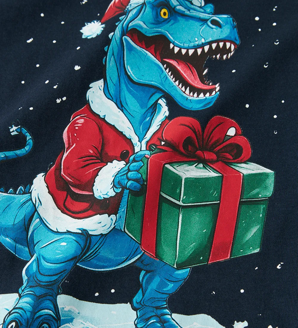 Fantastisk Name It bluse i navyblå med et sjovt print af en dinosaur iført nissehue, der holder en gave. Blusen har en rund halsudskæring med en smal ribkant og lange ærmer.