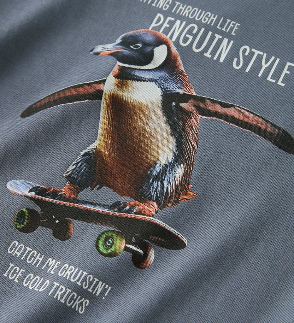 Skøn Name It bluse med lange ærmer i en afdæmpet blå farve. På fronten ses et print af en pingvin, der skater på et skateboard, samt teksten “Skating Through Life, Penguin Style”. Blusen har en rund halsudskæring med en smal ribkant.