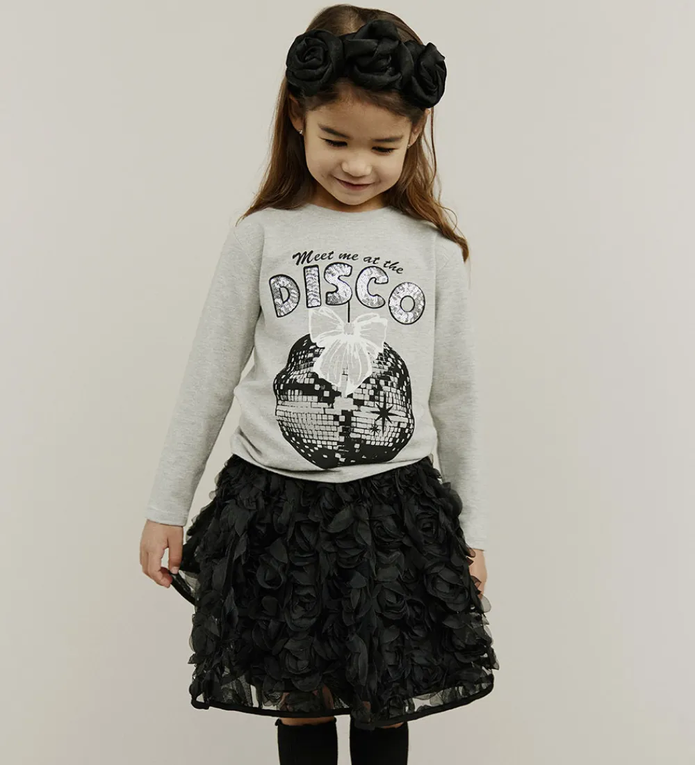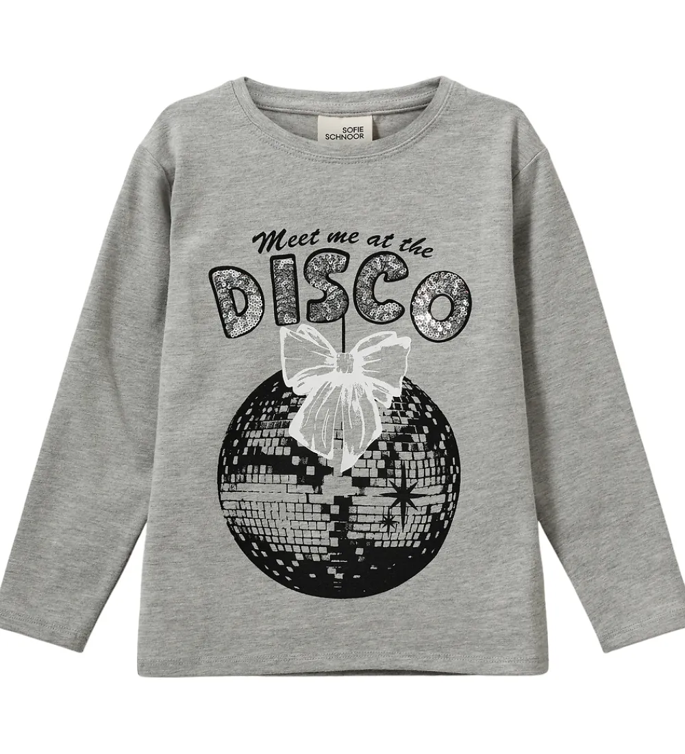 Blusen har et iøjnefaldende motiv af en diskokugle med en sløjfe samt teksten “Meet me at the DISCO” i forskellige skrifttyper. Materialet ser blødt ud, og blusen er designet med en klassisk rund halsudskæring.