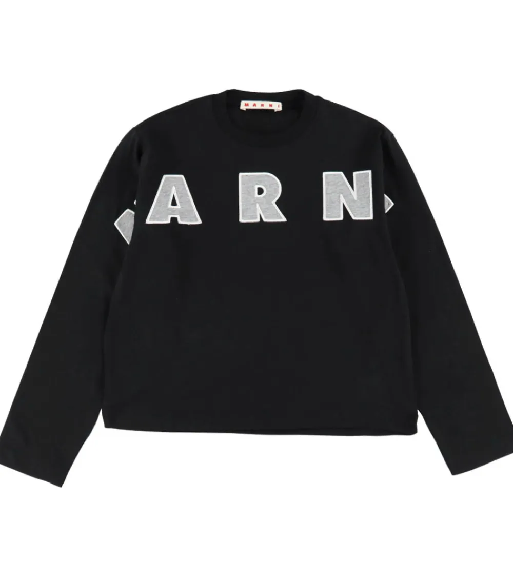 Stilfuld bluse fra Marni med lange ærmer, udført i en klassisk sort farve. Fortil står der “Marni” med store, applikerede bogstaver i meleret grå med hvide kanter. Designet giver et moderne og markant udtryk. Marni har skabt et tidløst look med dette simple, men iøjnefaldende design.