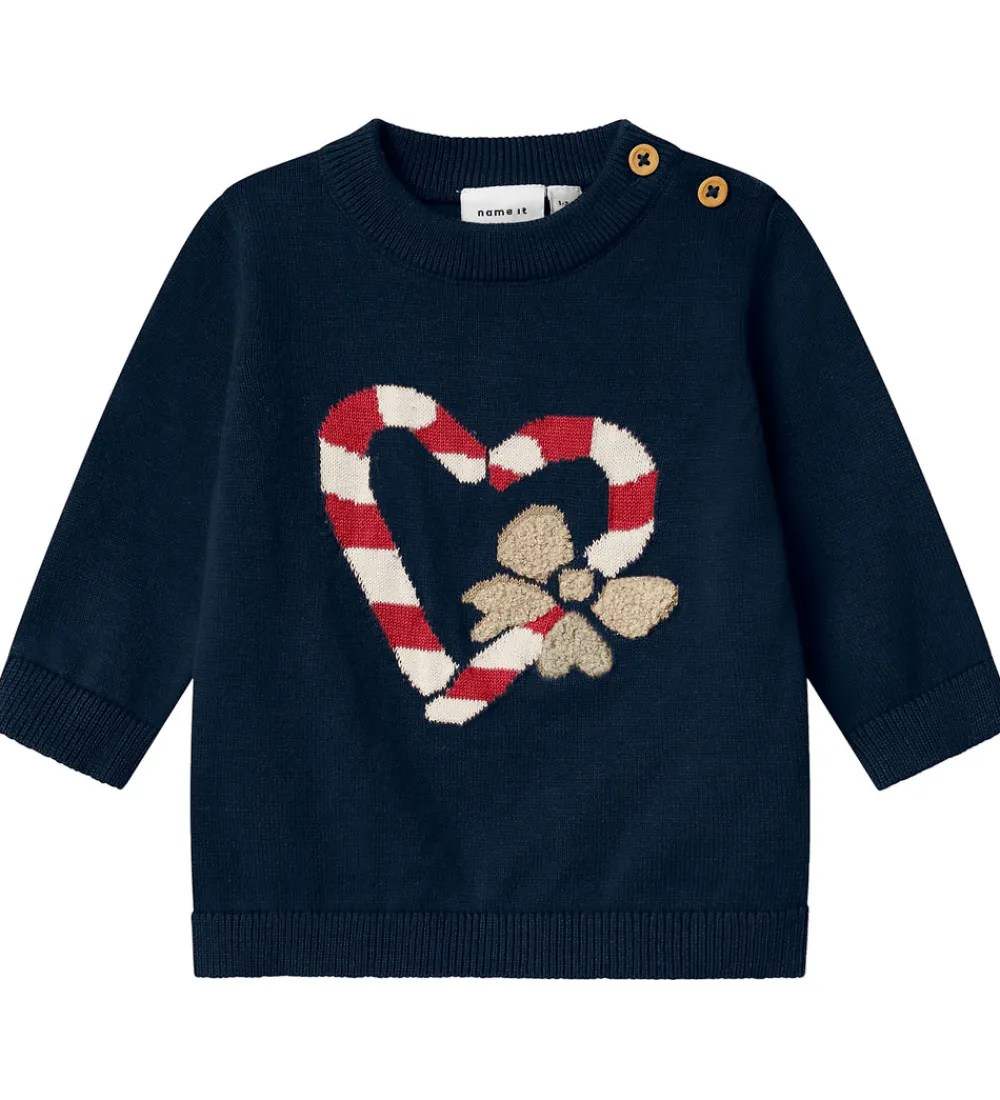 Skøn Name It bluse i navyblå strik med print på fronten af to slikstokke formet som et hjerte samt en sløjfe i beige frotté med glimmer. Blusen har en rund halsudskæring og lange ærmer med ribkanter.