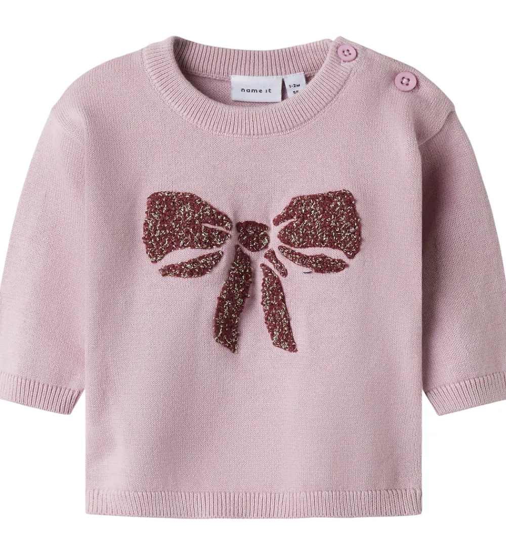 Elegant Name It bluse i en sart rosa nuance med lange ærmer. Blusen har en fin, rund halsudskæring med ribkant og dekorative knapper på skulderen. På fronten prydes blusen af et glitrende sløjfedetalje, der fremhæver den stilfulde enkelthed i designet. Name It sikrer et gennemført udtryk med denne bluse.